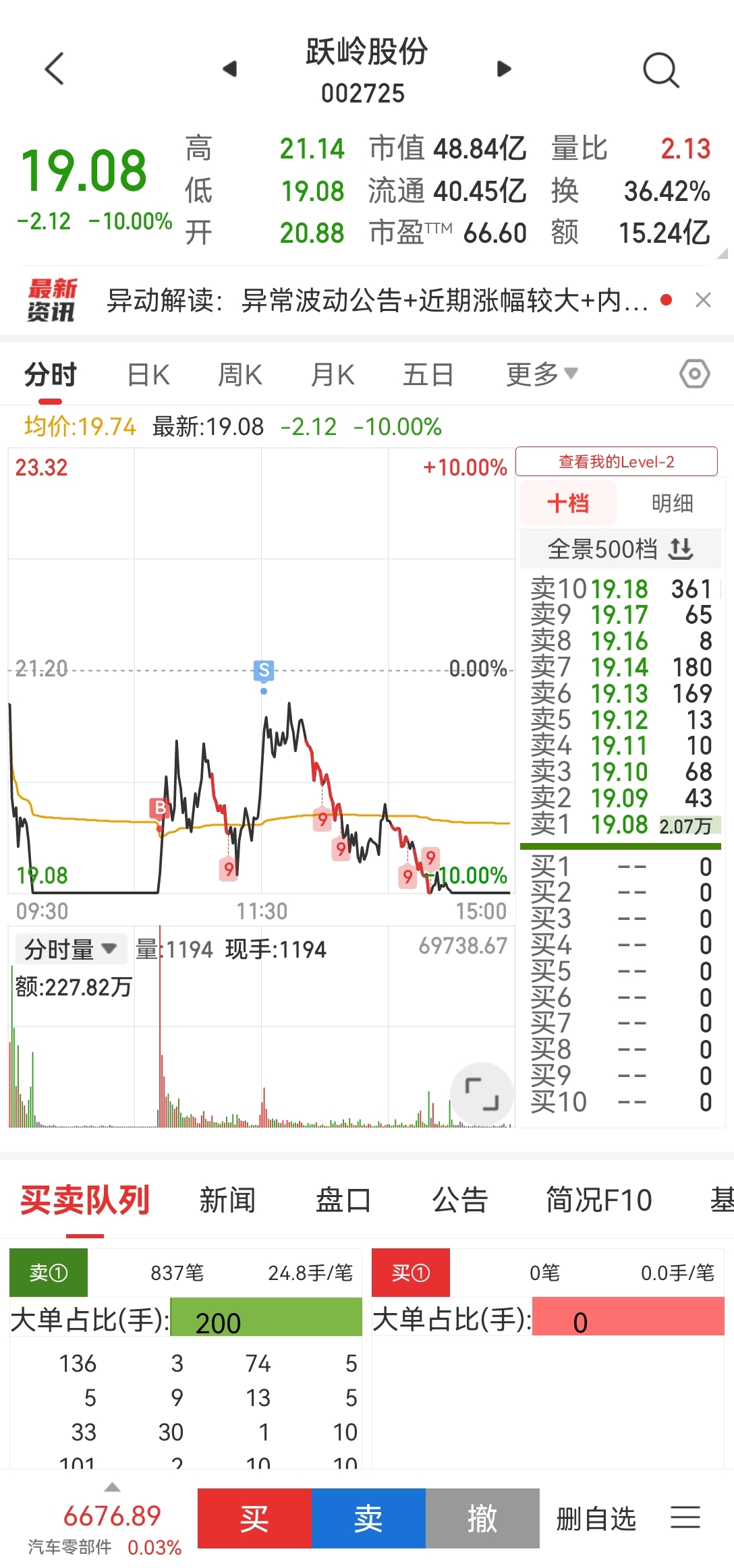 $跃岭股份(SZ002725)$ 今天翘板没跟上限价跟进了 有谁和我一样 尾盘居然又回去地上了 无语
