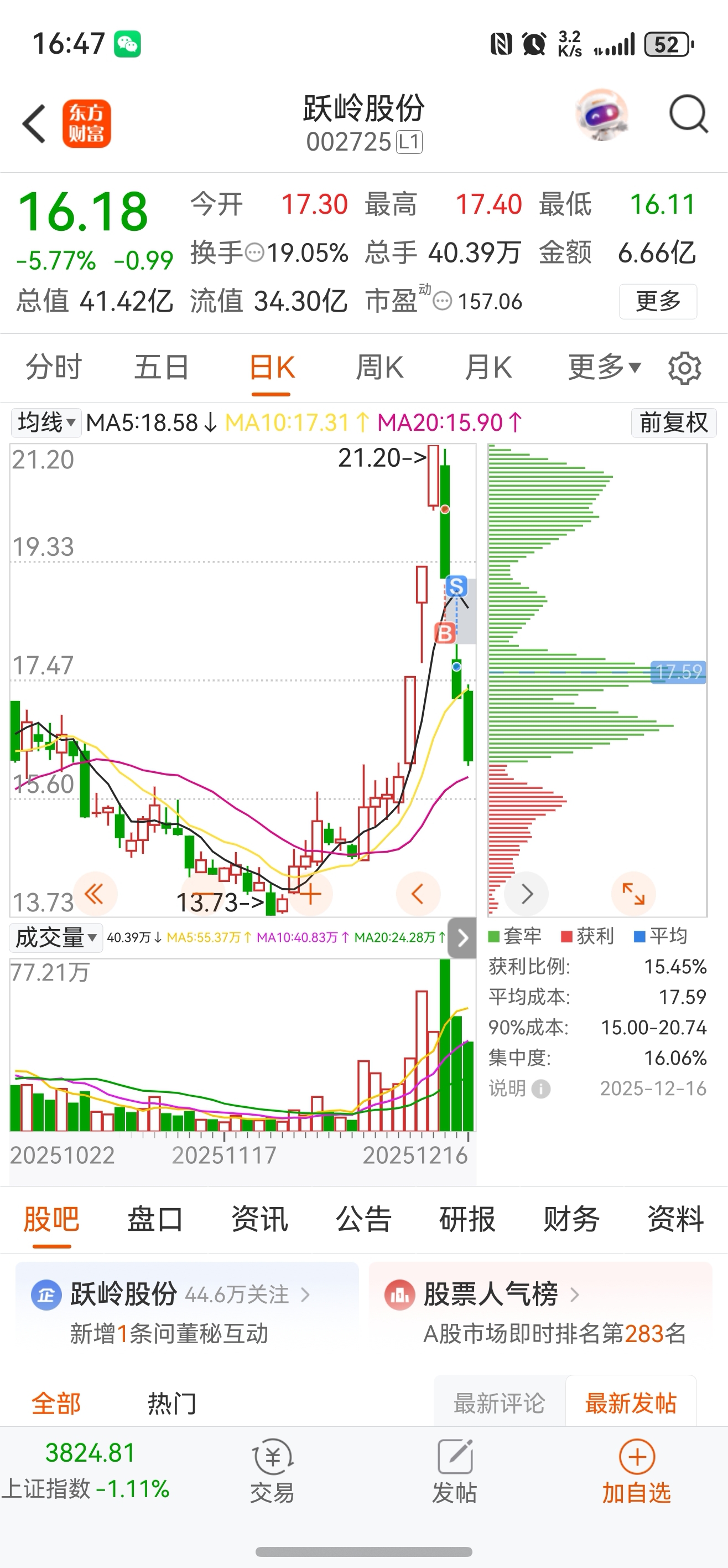 $跃岭股份(SZ002725)$ 好在昨天跑的块,少亏10个点