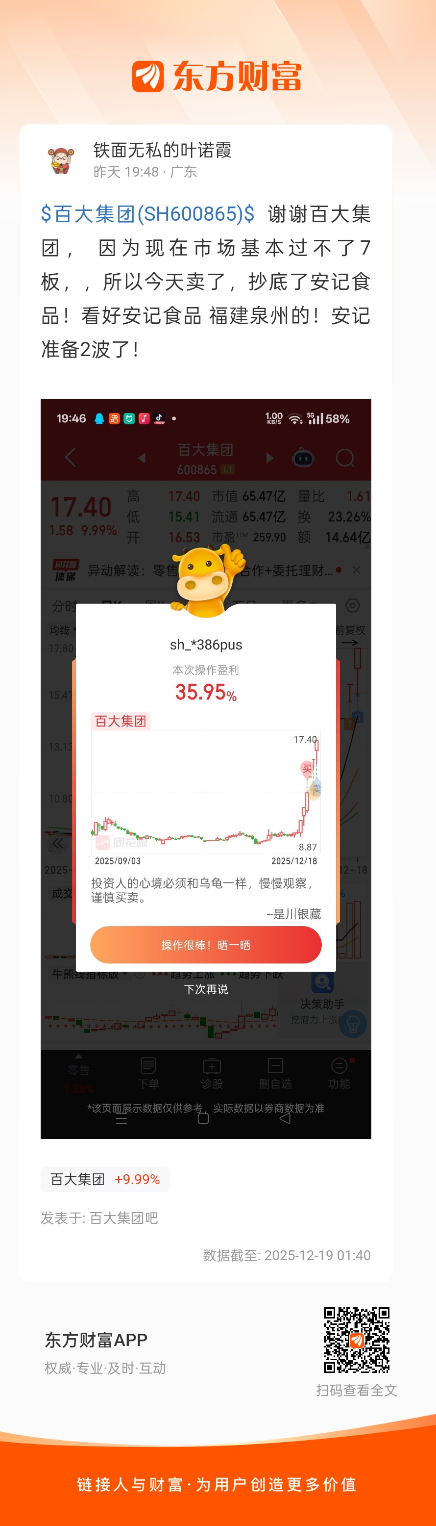 $百大集团(SH600865)$ 谢谢百大集团, 因为现在市场基本过不了7板,,所以今天卖了,抄底了安记食品!看好安记食品 福建泉州的!安记准备2波了!