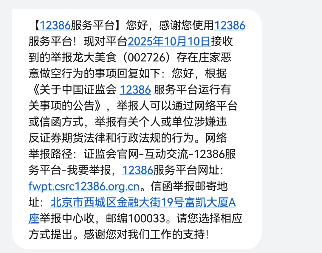 $龙大美食(SZ002726)$ 不知道有没有用,我也填了举报信,希望庄家