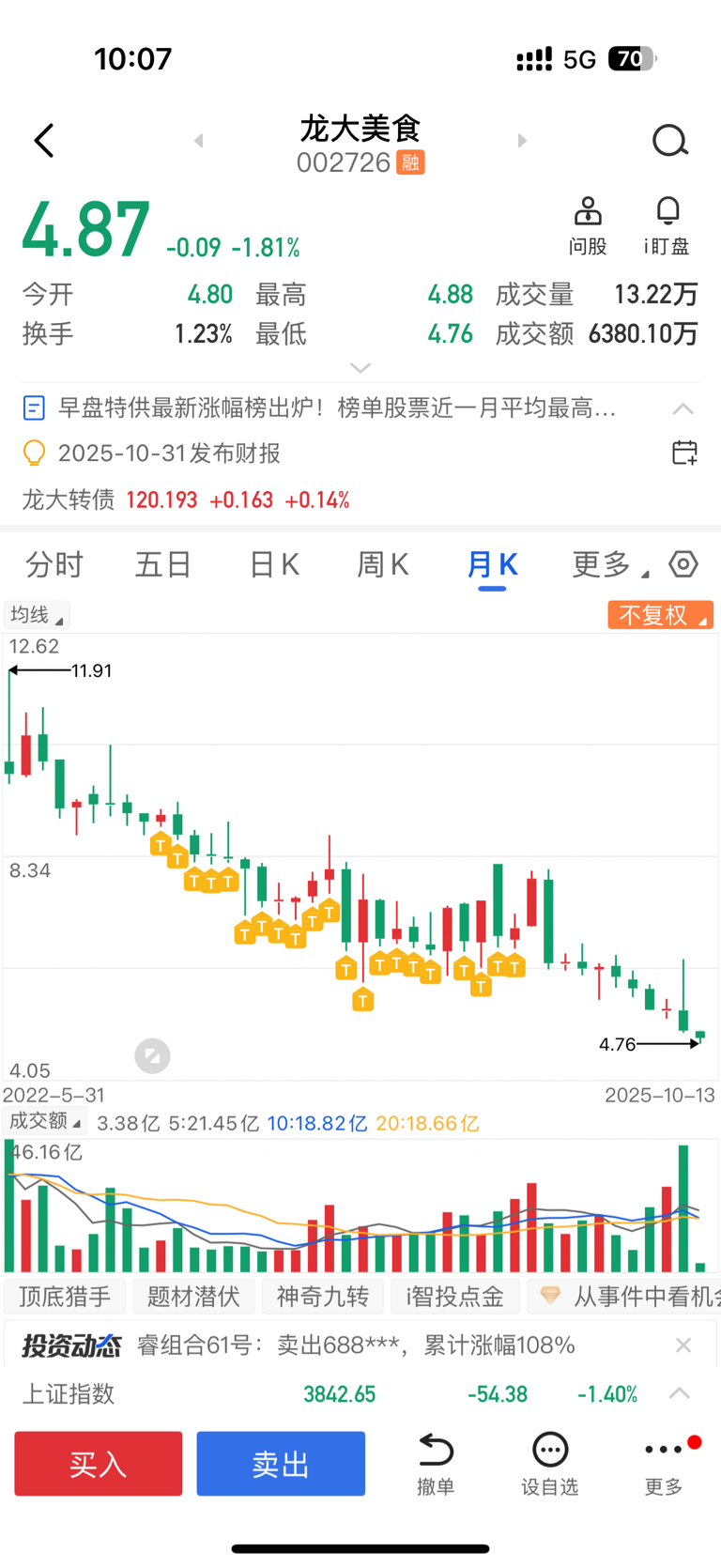 $龙大美食(SZ002726)$ 当时还不想走以为该涨了…现在看早走早赚钱,反正这里一直跌我还不如出去重新买一只至少有机会,买错了也没有关系因为放这里也是一直跌哈哈哈哈哈