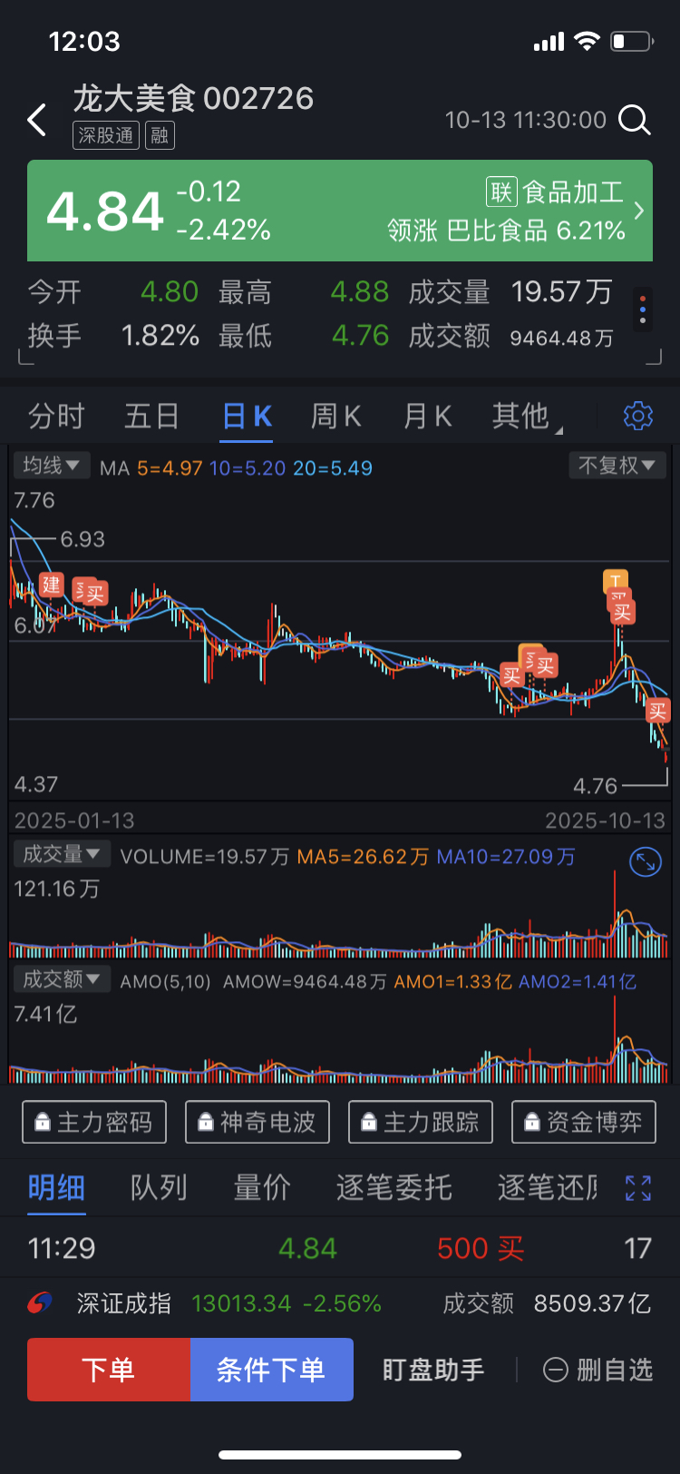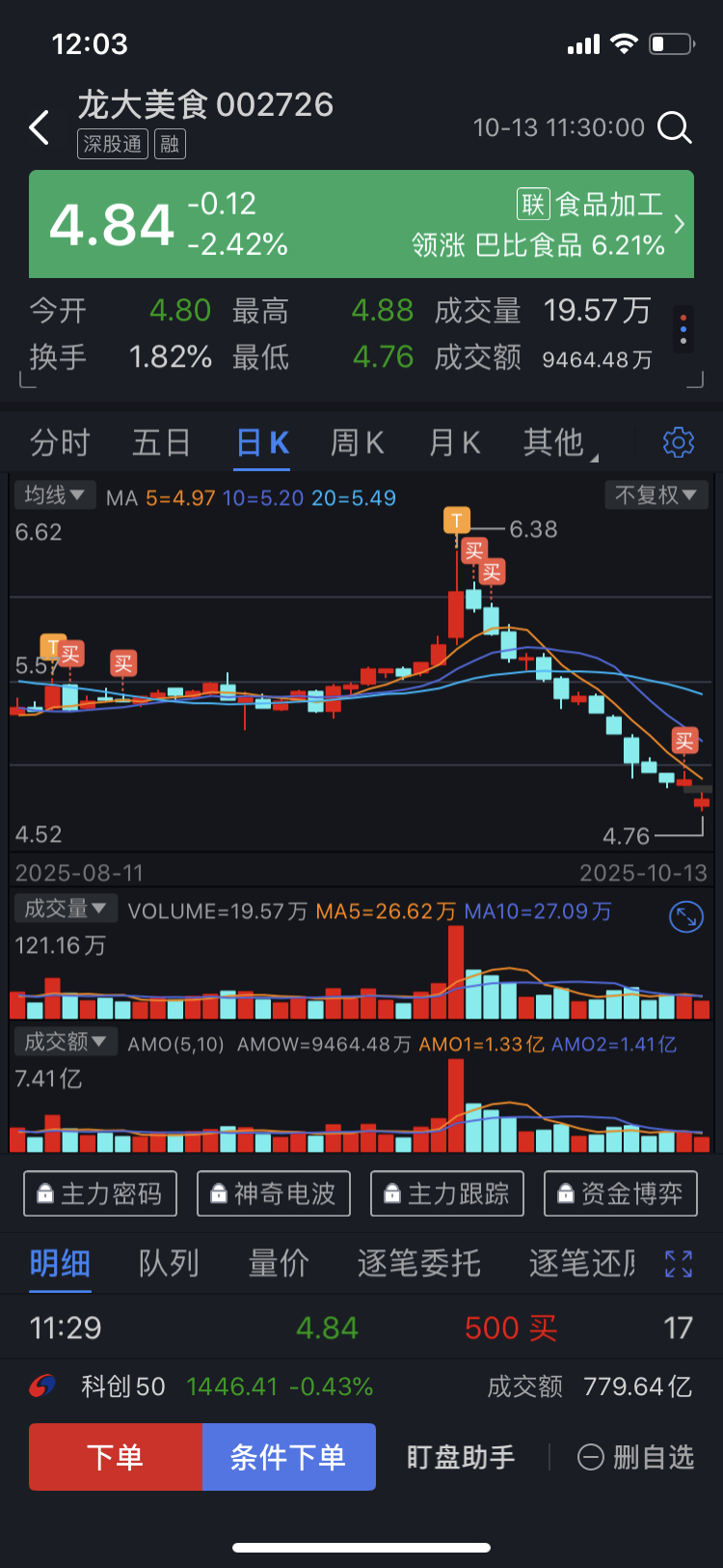$龙大美食(SZ002726)$ 只补仓,不减仓,再下跌10%继续补。