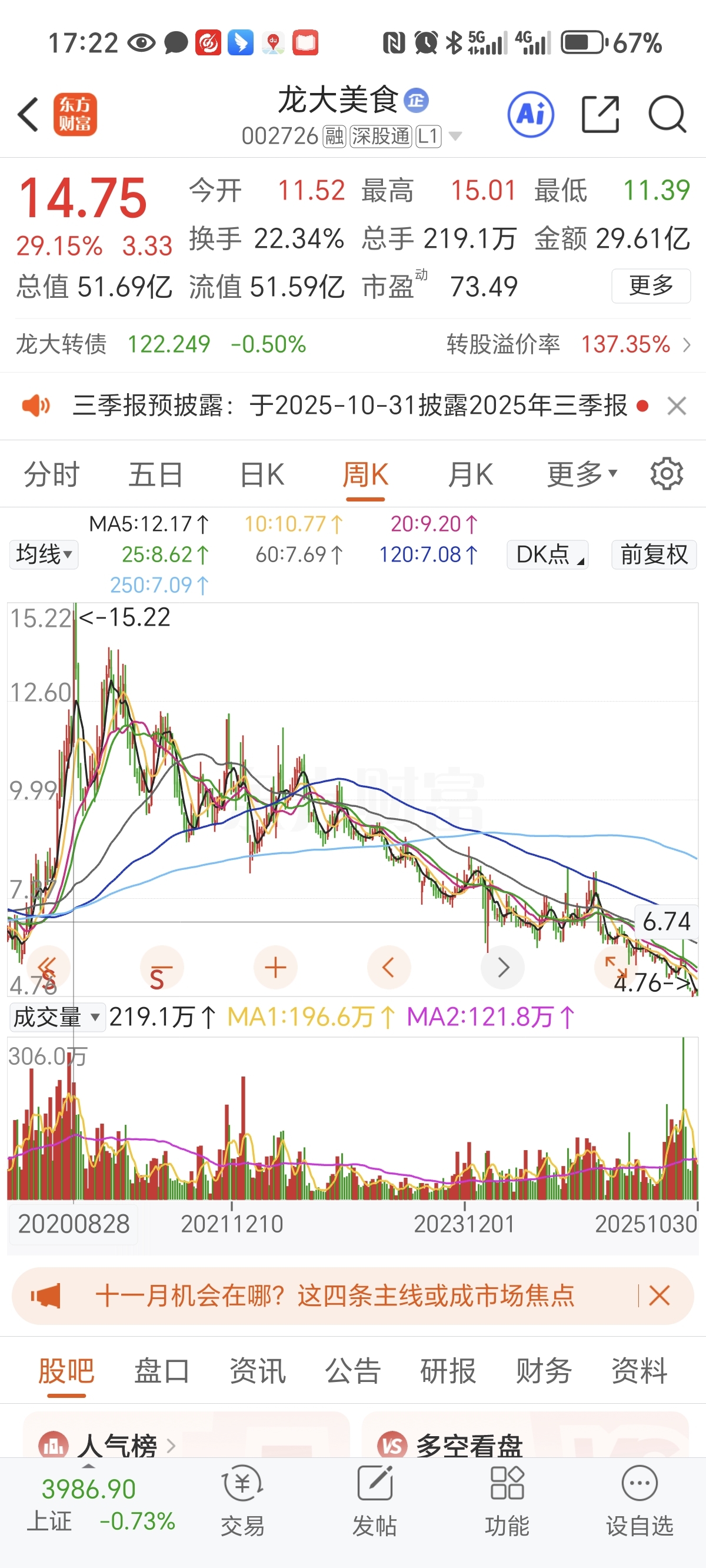 $龙大美食(SZ002726)$ 真的是牛逼了,跌了五年