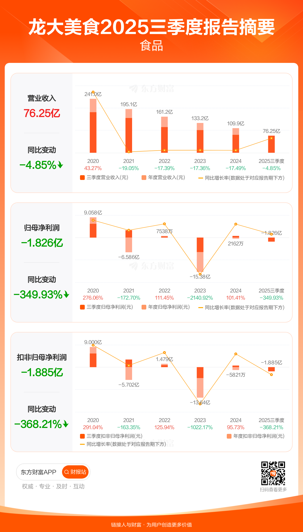 图解财报:龙大美食前三季归母净利润-1.83亿元,上年同期7304.10万元