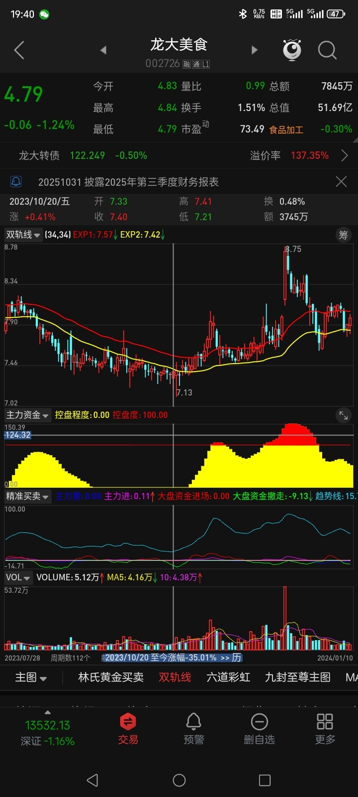 $龙大美食(SZ002726)$ 龙大的业绩不都是有预期的么,21后都是一年爆亏,一年盈利,参考2023年10.20的三季报,亏损将近7亿,股价反而涨了!所以这完全取决于庄的意思,亏损不一定会暴跌,况且前面已经暴跌了这么多,盈利也不一定会涨!