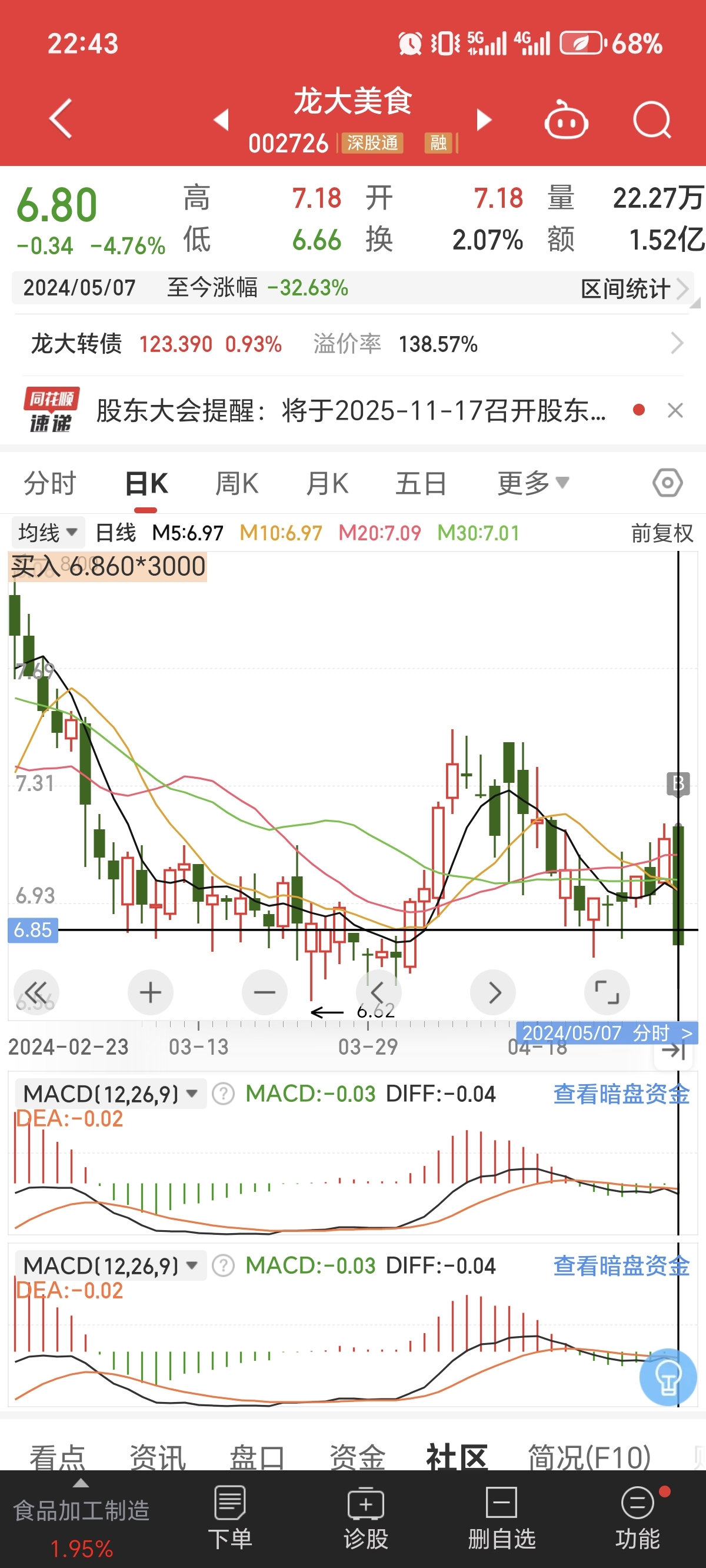 $龙大美食(SZ002726)$ 你们是在开玩笑,我是真的7块多买的