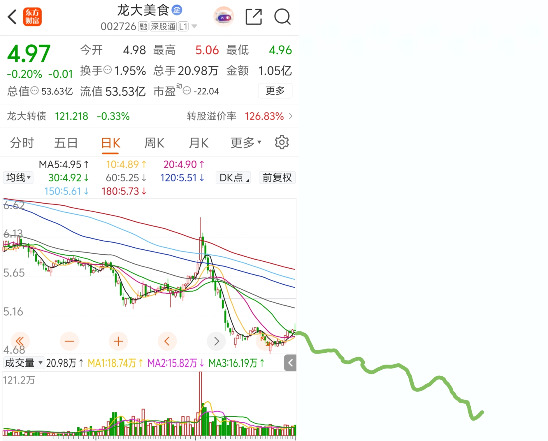 $龙大美食(SZ002726)$ 按照这个下跌的速度,明年末应该就能看到两块了