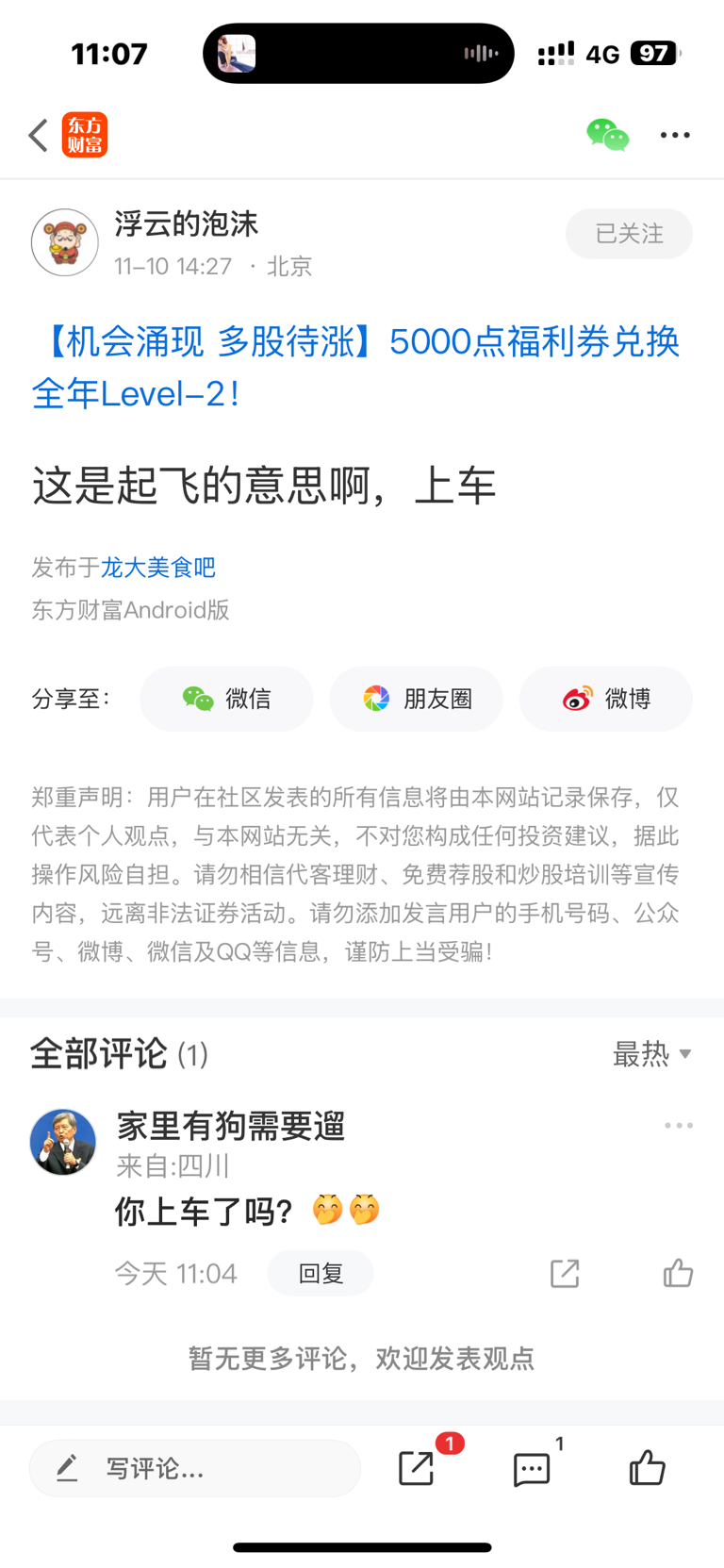 温馨提示: 1.根据《证券法》规定,禁止编造、传播虚假信息或者误导性信息,扰乱证券市场;2.用户在本社区发表的所有资料、言论等仅代表个人观点,与本网站立场无关,不对您构成任何投资建议。用户应基于自己的独立判断,自行决定证券投资并承担相应风险。《东方财富社区管理规定》