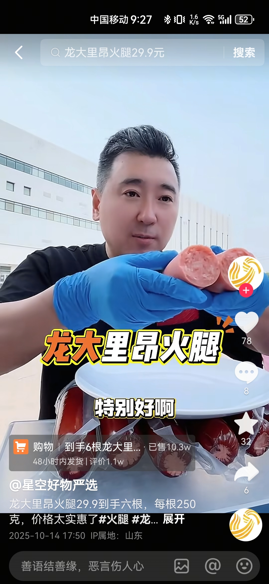 $龙大美食(SZ002726)$ 支持山东卫视,支持阿速,来一单!