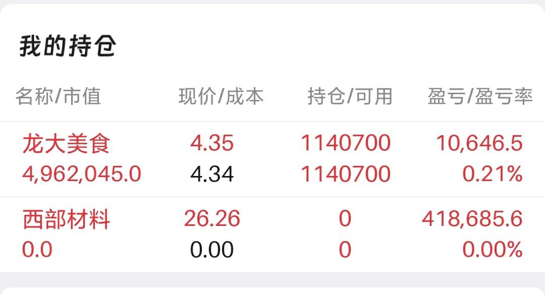 $龙大美食(SZ002726)$ 今天分7笔一直分批加仓全仓介入了!看好年底春节元旦的美食节行情!此股从9月份的7元下跌到现在4.3元已经跌了百分之50.已经严重超跌!后市必在一年一度节日带动下展开报复行情!目标价春节前上6元,这就是我今天之所以分7笔一直加到满仓的重要原因!大家看看我的交割单,进来讨论一下后市能否大肉伺候?