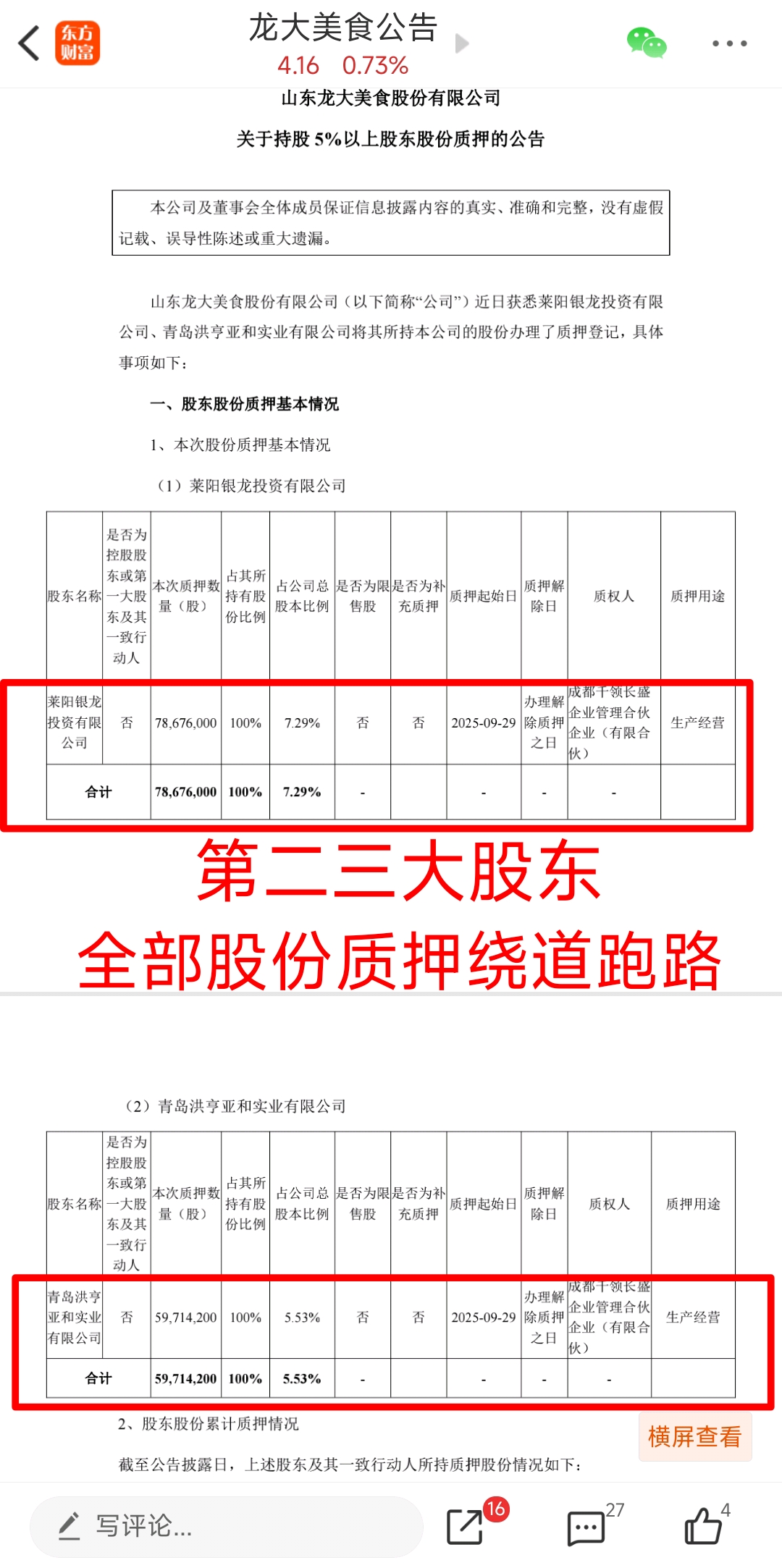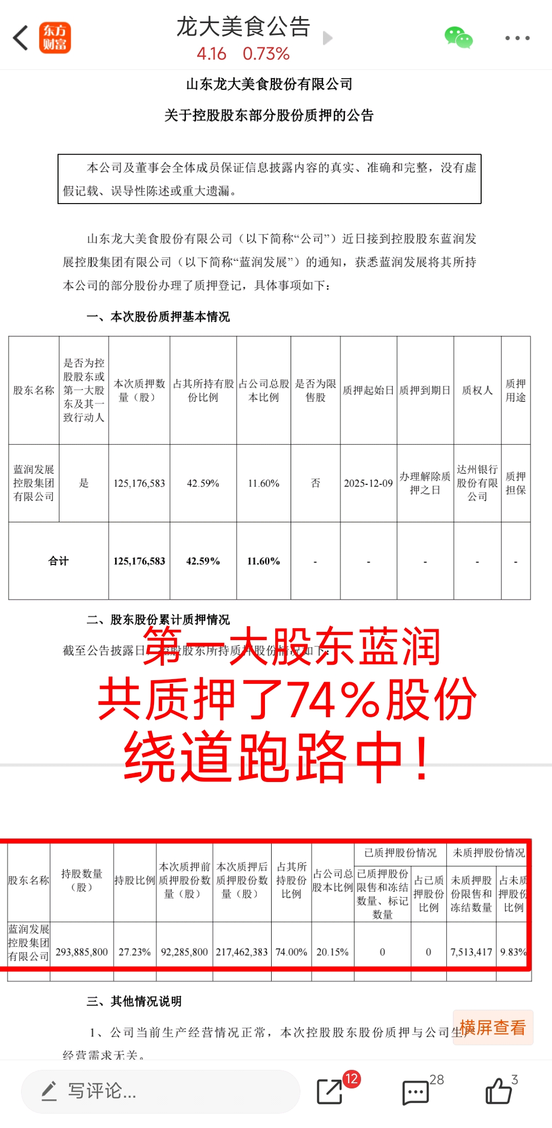 $龙大美食(SZ002726)$ 你们告诉大家,好公司会这样抢着全部质押股份吗?好公司会一路下跌吗?板块涨它跌,板块跌它大跌,这是好公司?好公司会负债几十亿吗?大家举报查一下三大股东和质押给的银行和机构,保准儿利益勾结,操纵股价,质押的股份都在暗地卖呢,他们帮着三大股东在每天减持跑路!这就是为什么每天一路下跌每天都是卖不完的筹码!