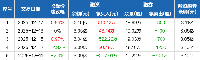 融资方面,当日融资买入1068.37万元,融资偿还558.26万元,融资净买入510.12万元。融券方面,融券卖出400股,融券偿还700股,融券余量18.99万股,融券余额79.95万元。融资融券余额合计3.11亿元。