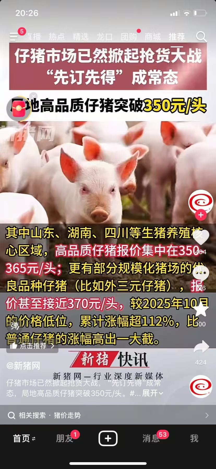 $龙大美食(SZ002726)$ 猪肉暴涨