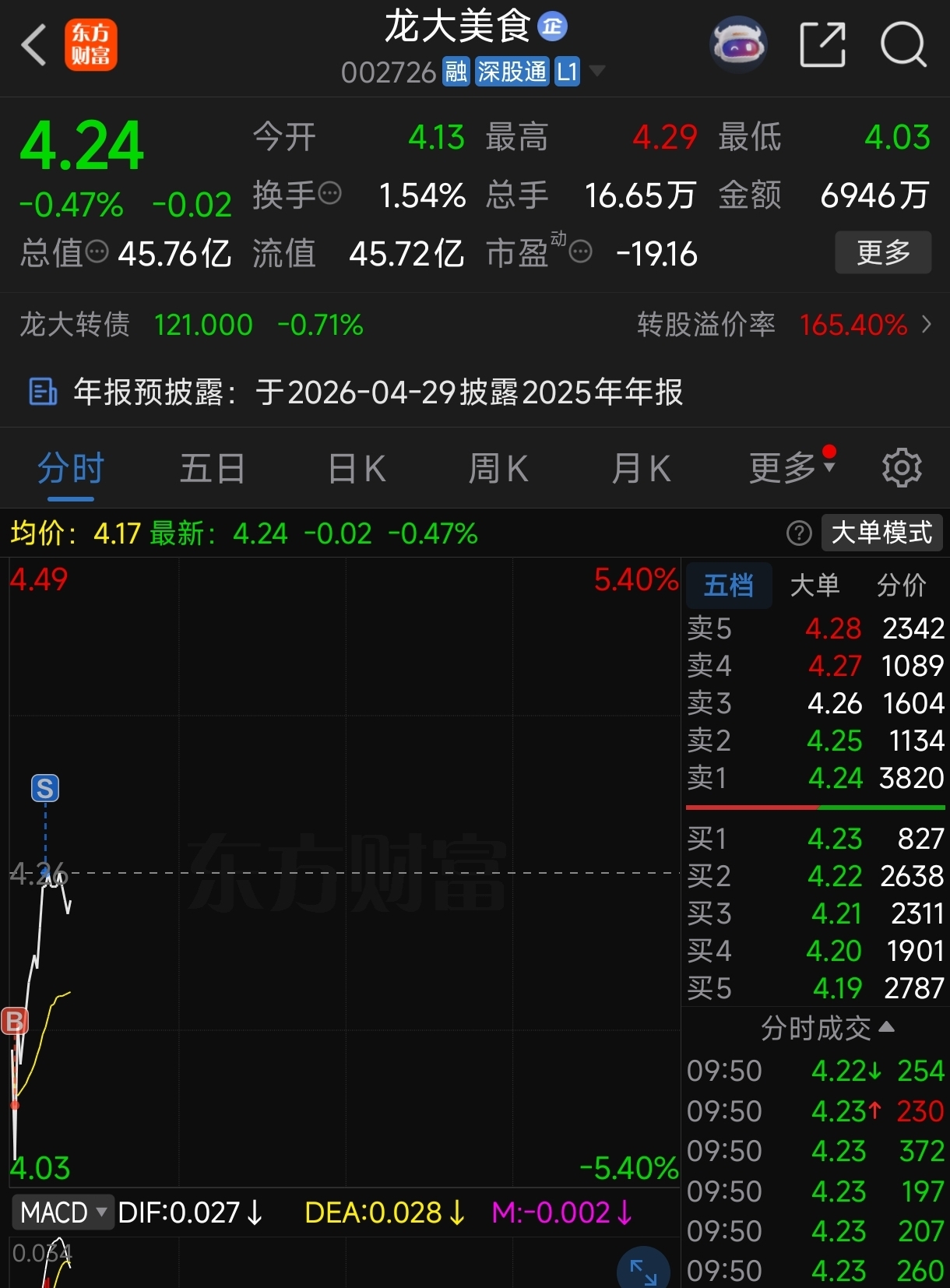 $龙大美食(SZ002726)$ 不可恋战,快进快出。此股最近妖的很。