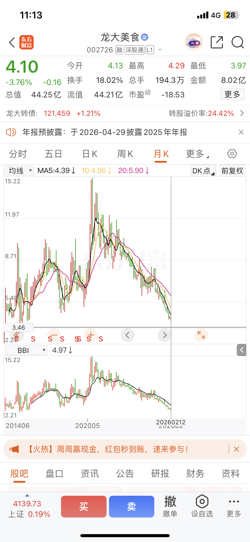 $龙大美食(SZ002726)$ 下面3.4的附近的缺口一定会去