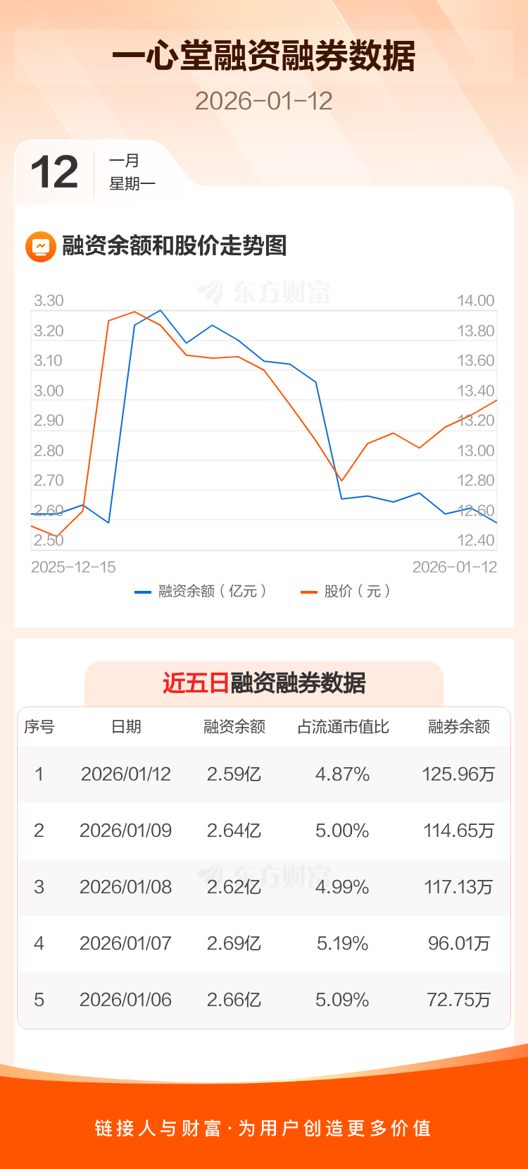 交易所最新数据显示,一心堂于2026年1月12日获融资买入2934.87万元,融资偿还3459.56万元,当日融资净偿还524.69万元。目前,该股融资余额2.59亿,占流通市值比例为4.87%。