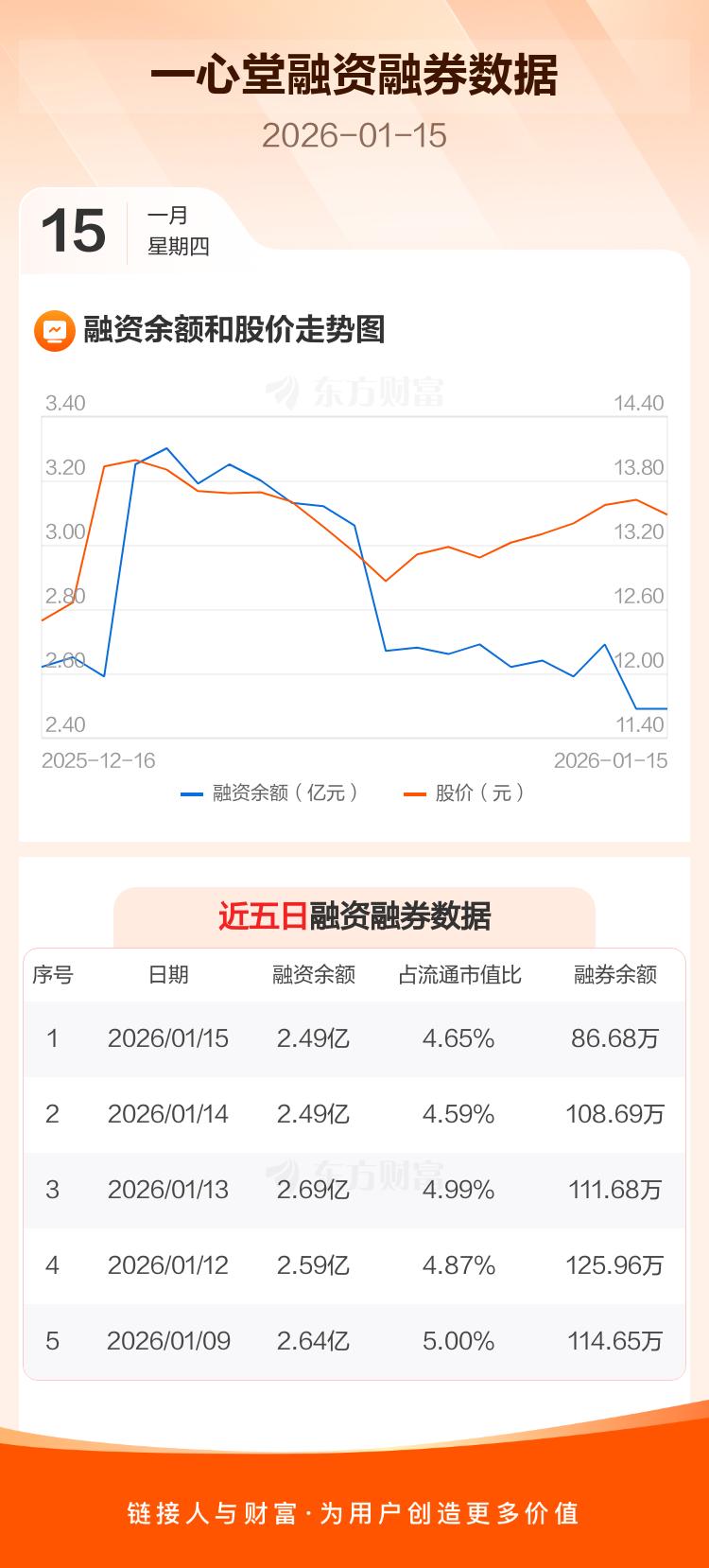 交易所最新数据显示,一心堂于2026年1月15日获融资买入1156.97万元,融资偿还1118.76万元,当日融资净买入38.21万元。目前,该股融资余额2.49亿,占流通市值比例为4.65%。