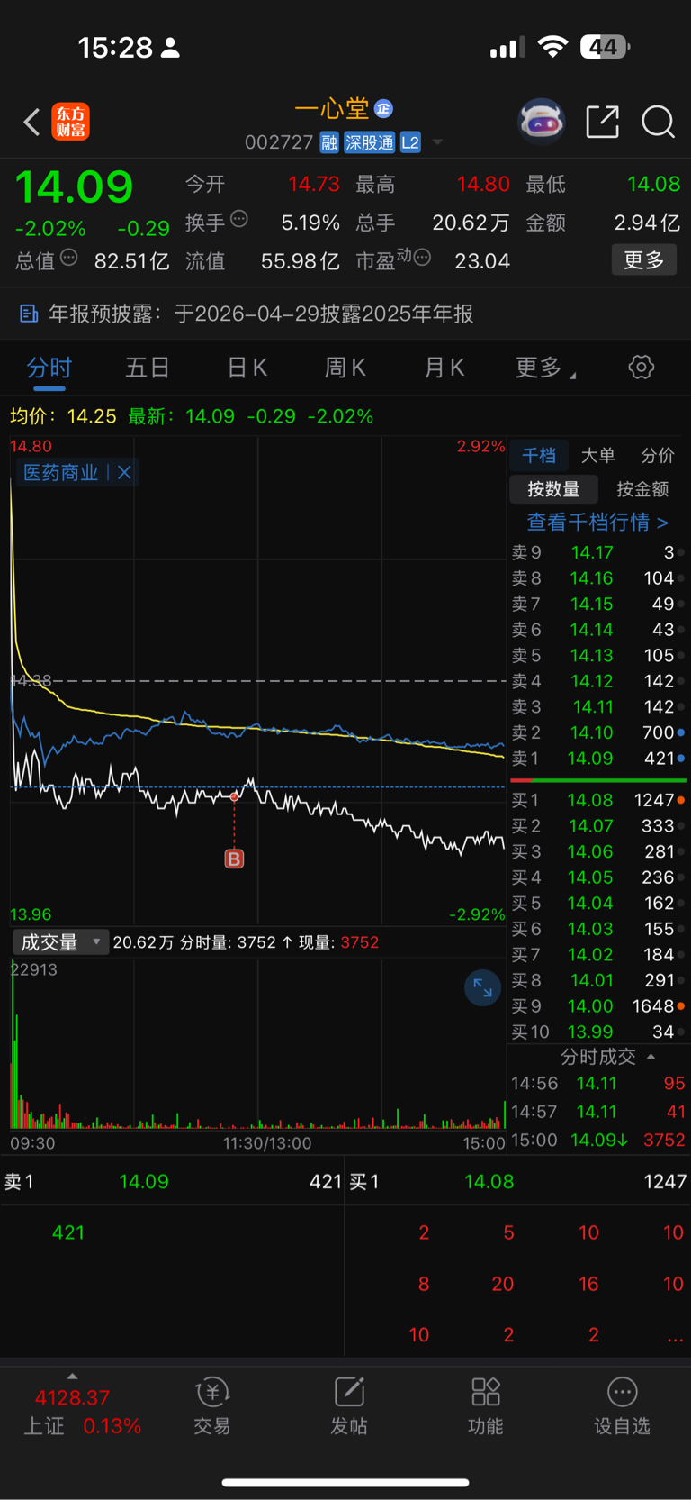 $一心堂(SZ002727)$ 这样一路向南,没等尾盘没等恐慌。