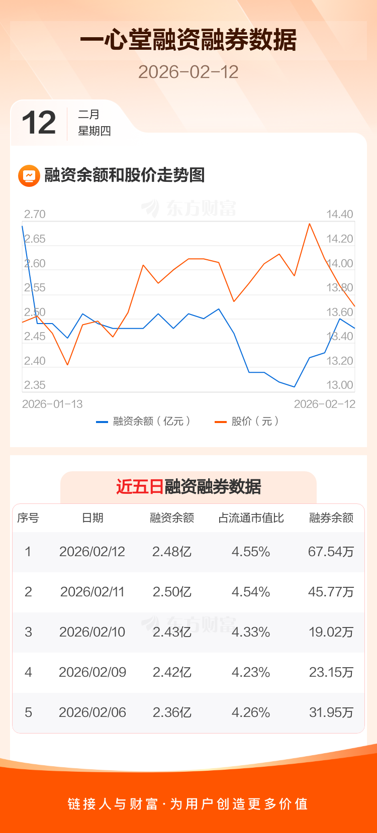 交易所最新数据显示,一心堂于2026年2月12日获融资买入1501.19万元,融资偿还1734.98万元,当日融资净偿还233.79万元。目前,该股融资余额2.48亿,占流通市值比例为4.55%。