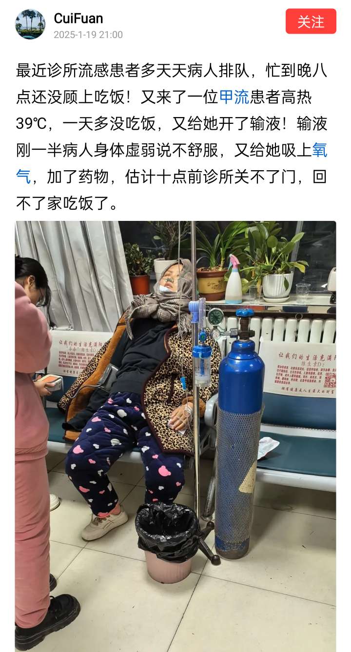 $特一药业(SZ002728)$ 最近诊所流感患者多天天病人排队,忙到晚八点还没顾上吃饭!又来了一位甲流患者高热39℃,一天多没吃饭,又给她开了输液!输液刚一半病人身体虚弱说不舒服,又给她吸上氧气,加了药物,估计十点前诊所关不了门,回不了家吃饭了。