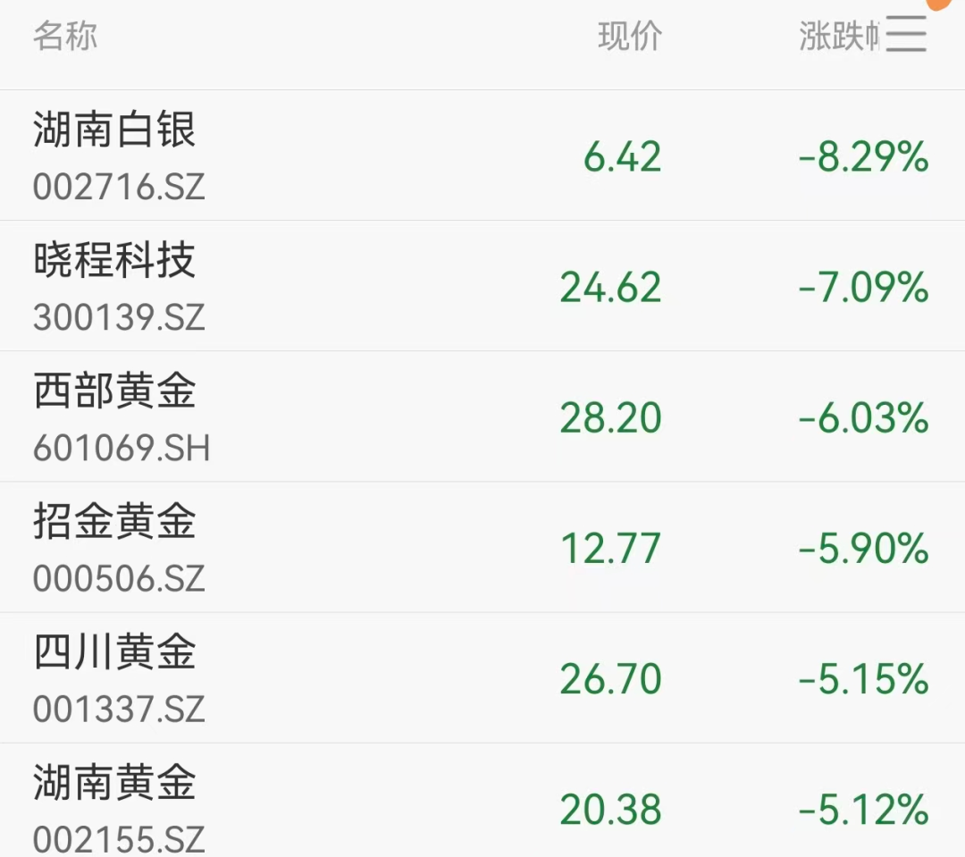 黄金概念股集体下挫,湖南白银一度跌停,西部黄金、招金黄金、四川黄金等跌超5%。