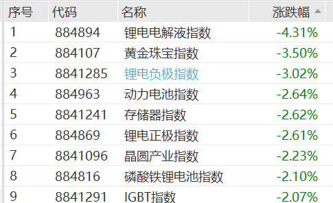 锂电相关概念跌幅居前,存储芯片概念普遍调整,同有科技、华天科技、兆易创新跌超5%。