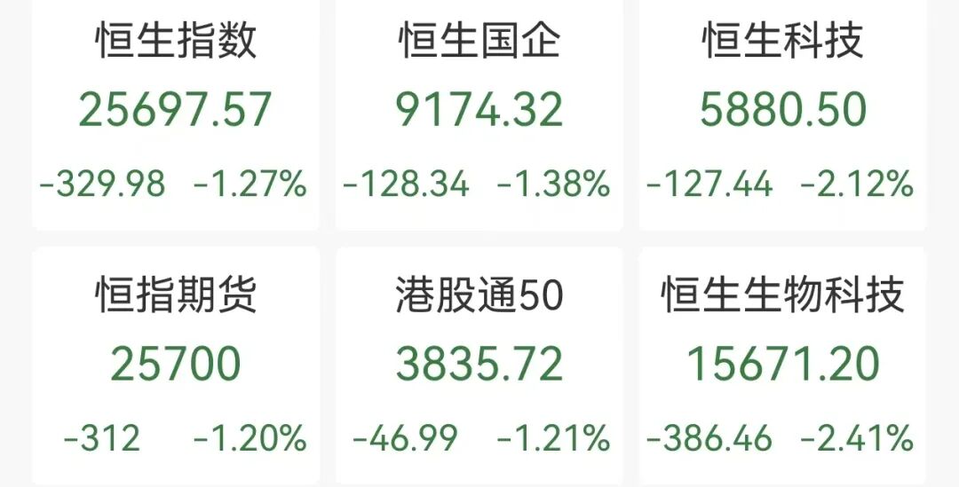 此外,港股午间收盘,恒生指数跌1.27%,恒生科技指数跌2.12%。大型科技股全线下跌,网易跌逾5%,华虹半导体跌超4%,百度、阿里巴巴跌近3%。