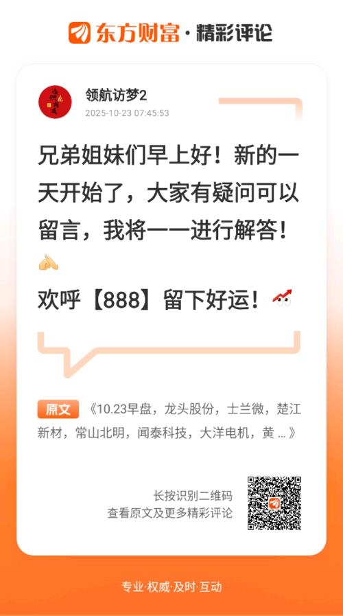 //@领航访梦2 :兄弟姐妹们早上好!新的一天开始了,大家有疑问可以留言,我将一一进行解答!欢呼【888】留下好运! $特一药业(SZ002728)$$神开股份(SZ002278)$$黄河旋风(SH600172)$