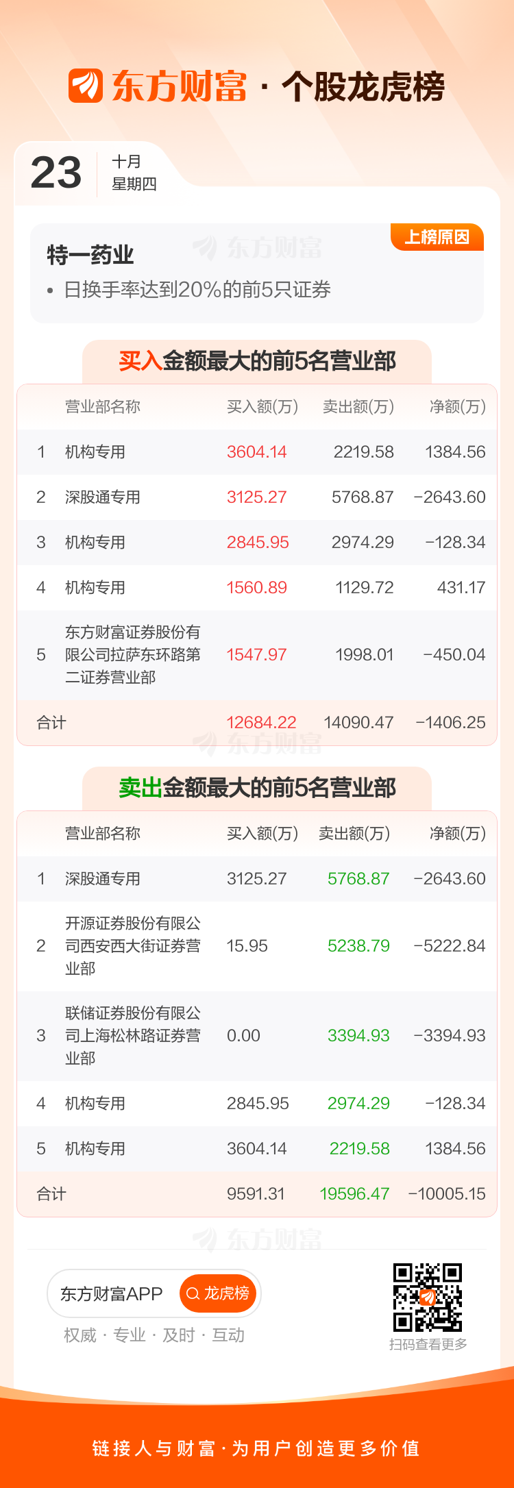 交易所2025年10月23日公布的交易公开信息显示,特一药业因成为日换手率达到20%的前5只证券上榜。特一药业当日收报10.75元,涨跌幅-3.07%,偏离值43.32%,换手率38.12%,成交额16.03亿。