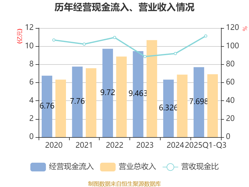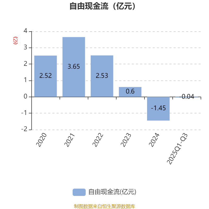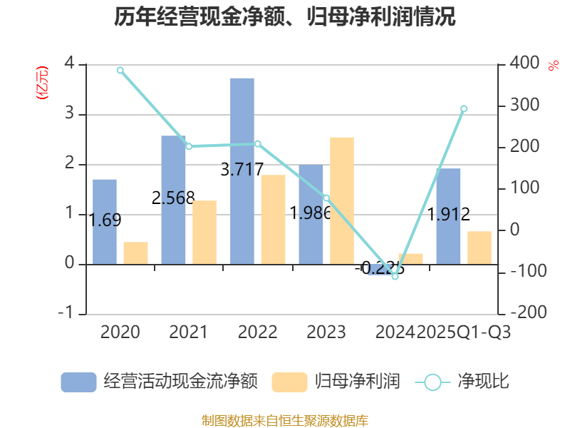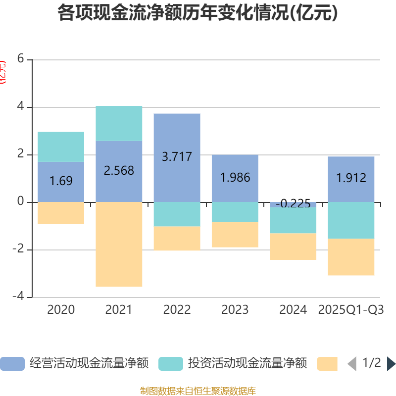 2025年前三季度,公司经营活动现金流净额为1.91亿元,同比增加2.29亿元;筹资活动现金流净额-1.54亿元,同比减少2.16亿元;投资活动现金流净额-1.55亿元,上年同期为-2.9亿元。