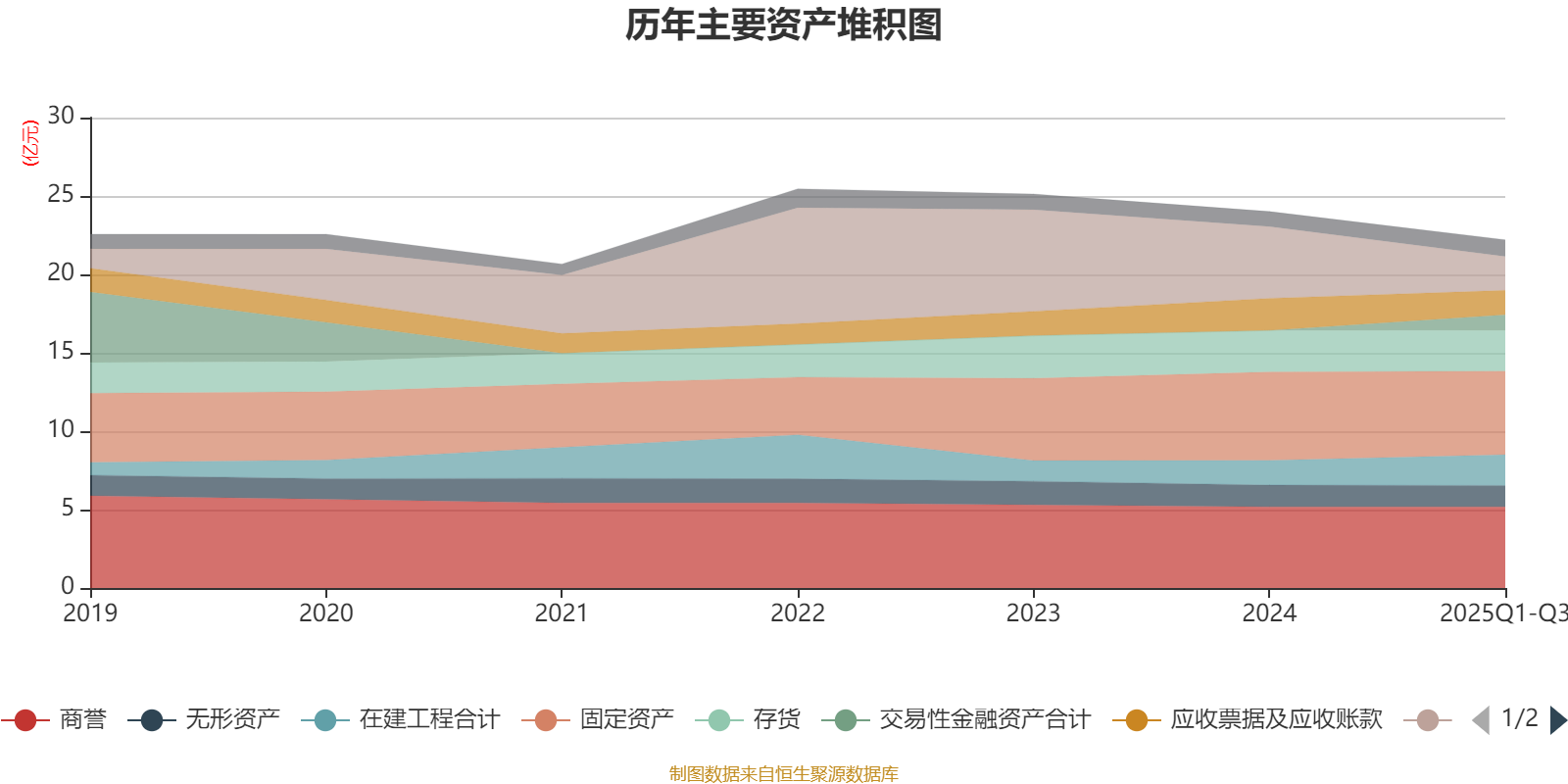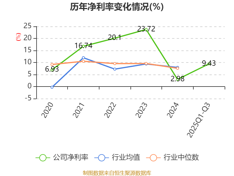 资产重大变化方面,截至2025年三季度末,公司货币资金较上年末减少52.91%,占公司总资产比重下降9.35个百分点;交易性金融资产合计占公司总资产的4.5%,上年末为0;在建工程合计较上年末增加24.76%,占公司总资产比重上升2.29个百分点;商誉较上年末没有变化,占公司总资产比重上升1.75个百分点。