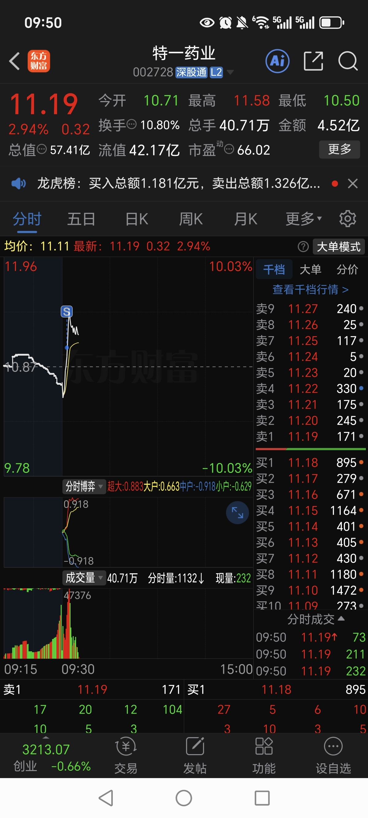 昨天10.66打野抄的特一药业,一早11.06卖飞,祝留下兄弟吃肉