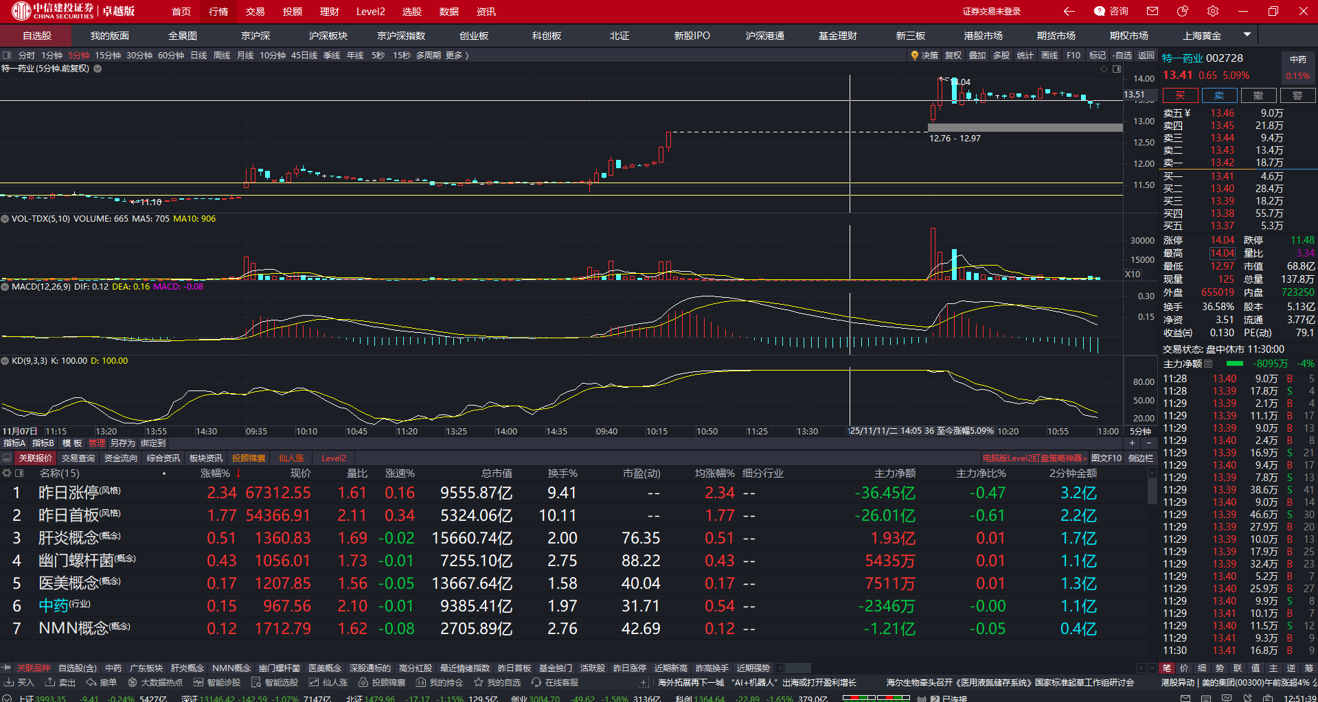 午评:特一药业早上一度拉涨停之后炸板目前来讲是在构筑一个五分钟次级别中枢就看下午