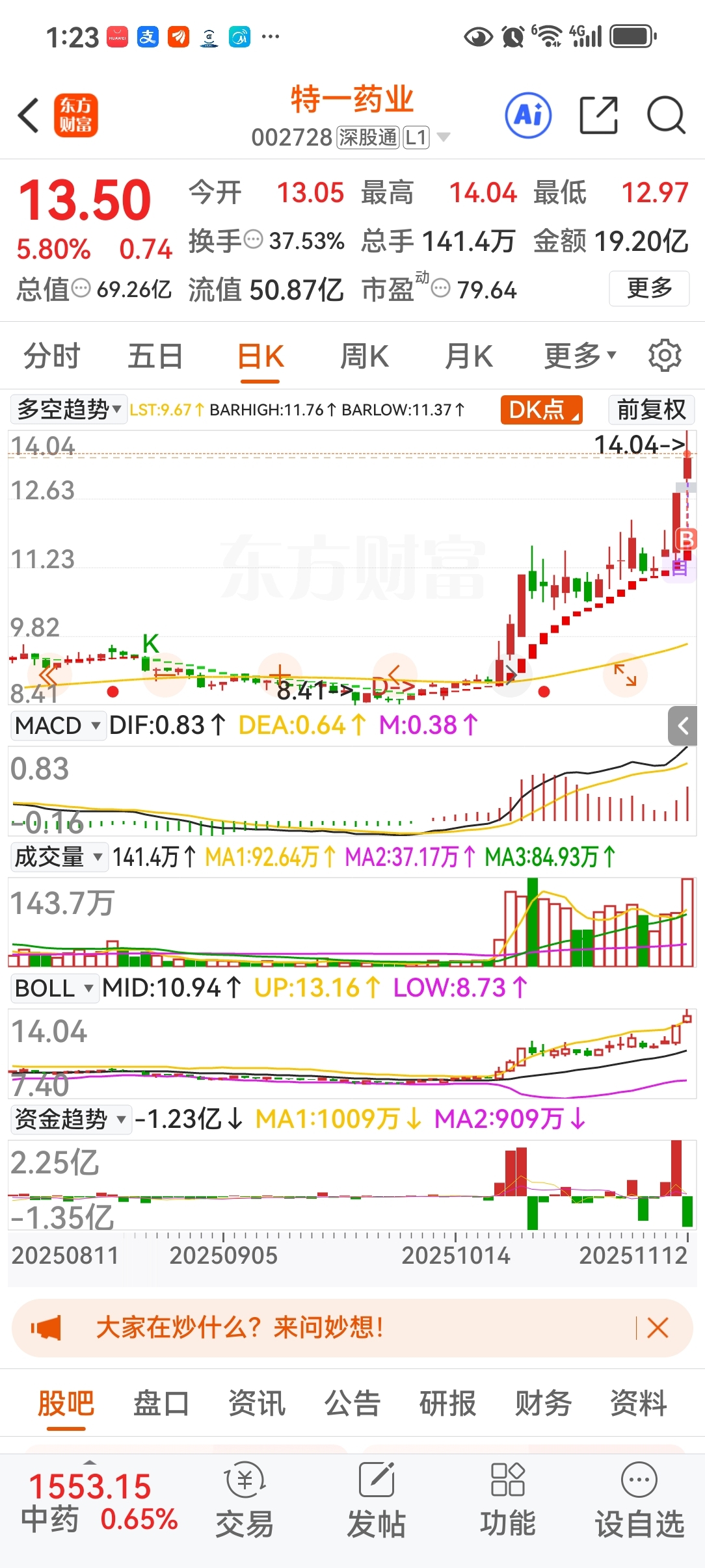 $特一药业(SZ002728)$ 我只看下面量,感觉有戏,近段时间流感大流行,该中药板块轮动了!换手率大也证明买的多!