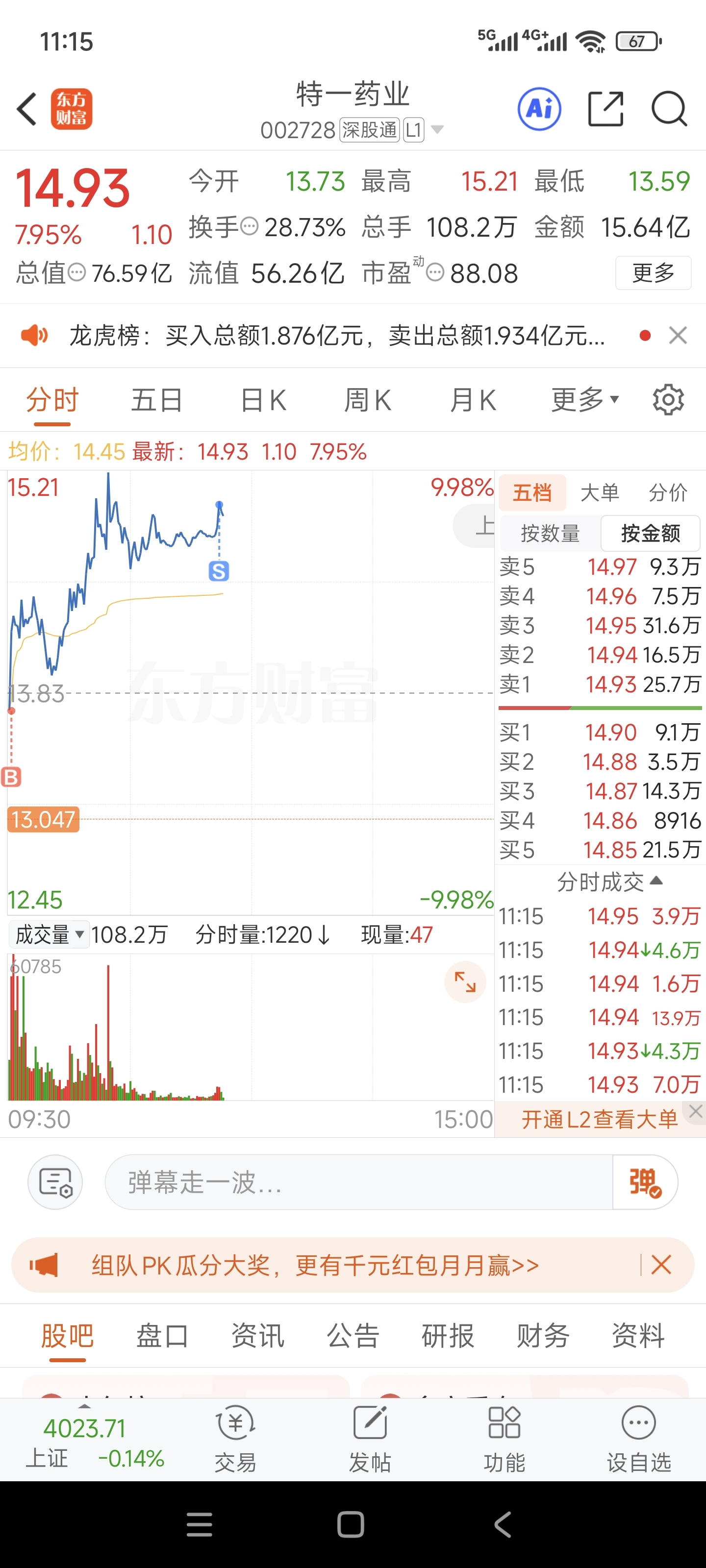 $特一药业(SZ002728)$ 老夫炒了一辈子股票,今天终于做成功了一回T,还是9个点的盘中T,苍天啊,你今天终于睁开眼睛了