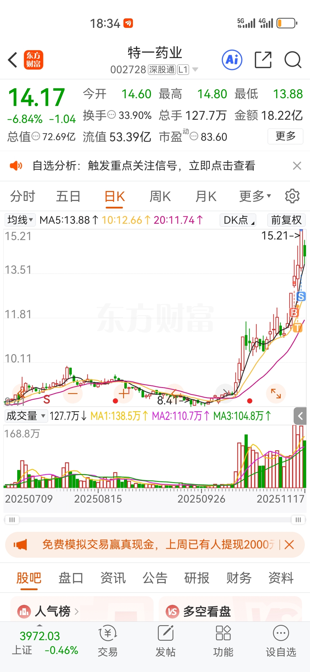 $特一药业(SZ002728)$ 人生就像一场戏,在最高位卖了