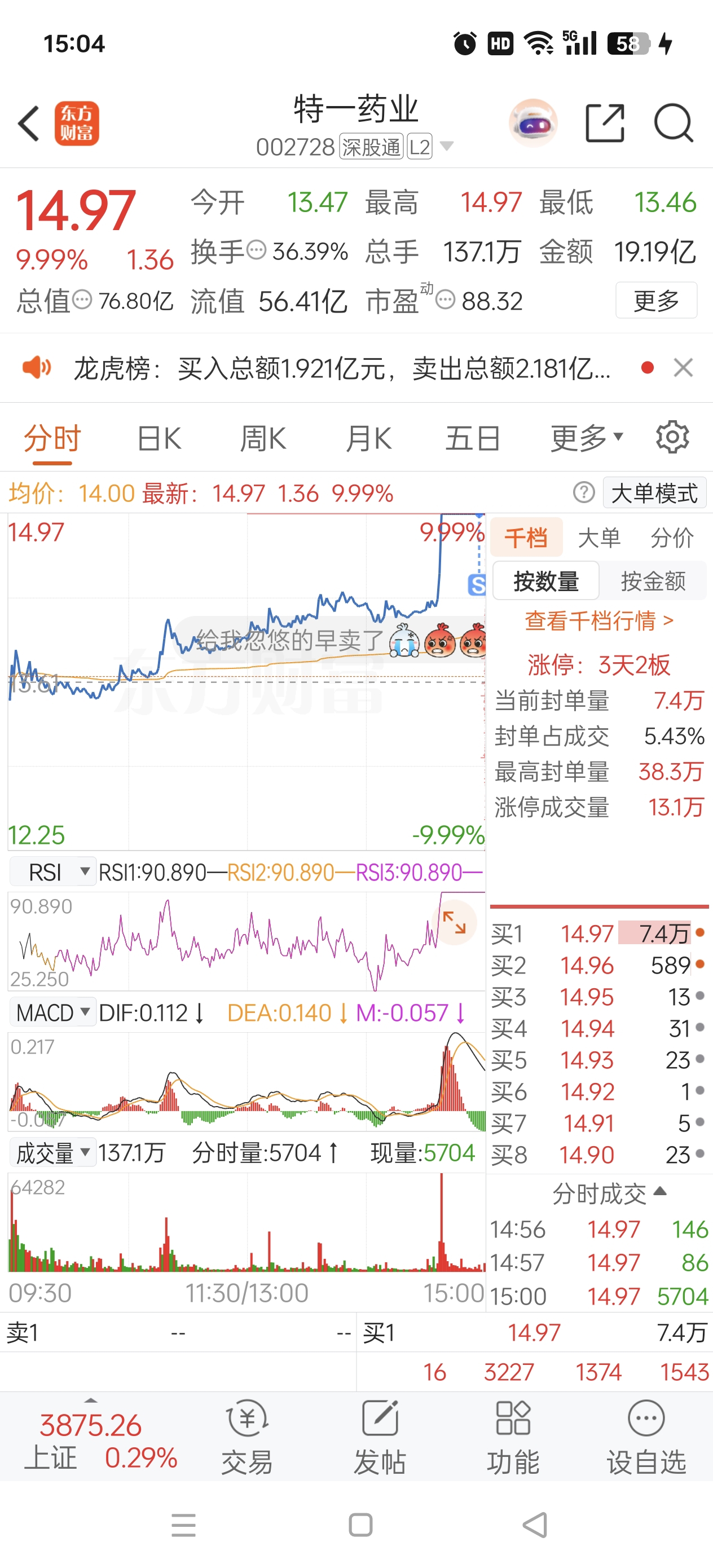 $特一药业(SZ002728)$ 跑了跑了,明天溢价也不吃了,