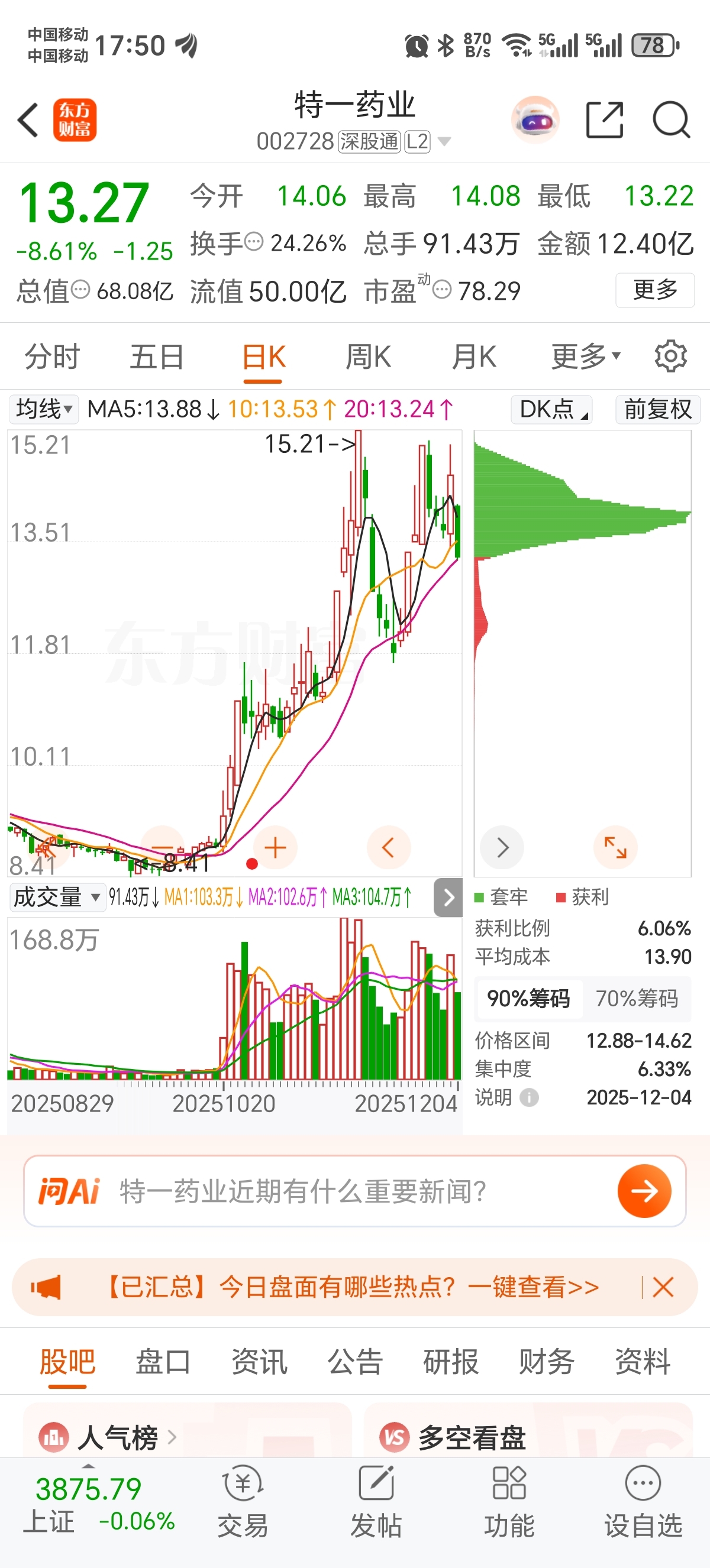 $特一药业(SZ002728)$ 这下好了,全是套牢筹码,何时能解套,将会是路慢慢