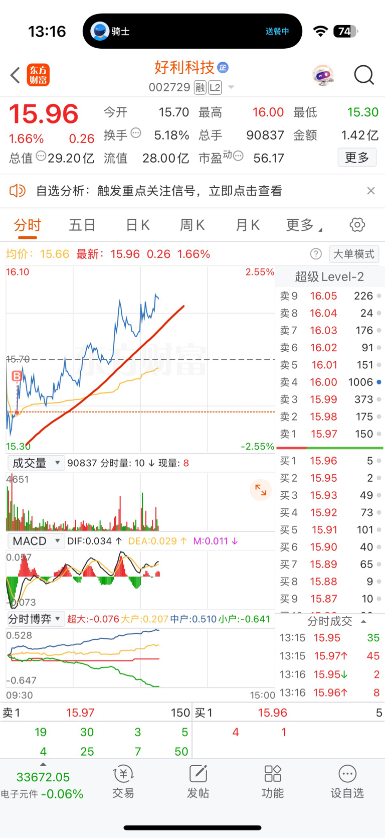$好利科技(SZ002729)$ 接回来了,一浪比一浪高,看看尾盘给不给机会加仓