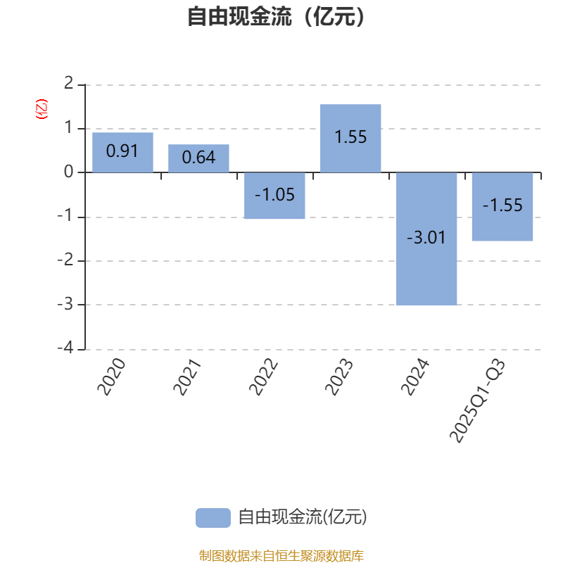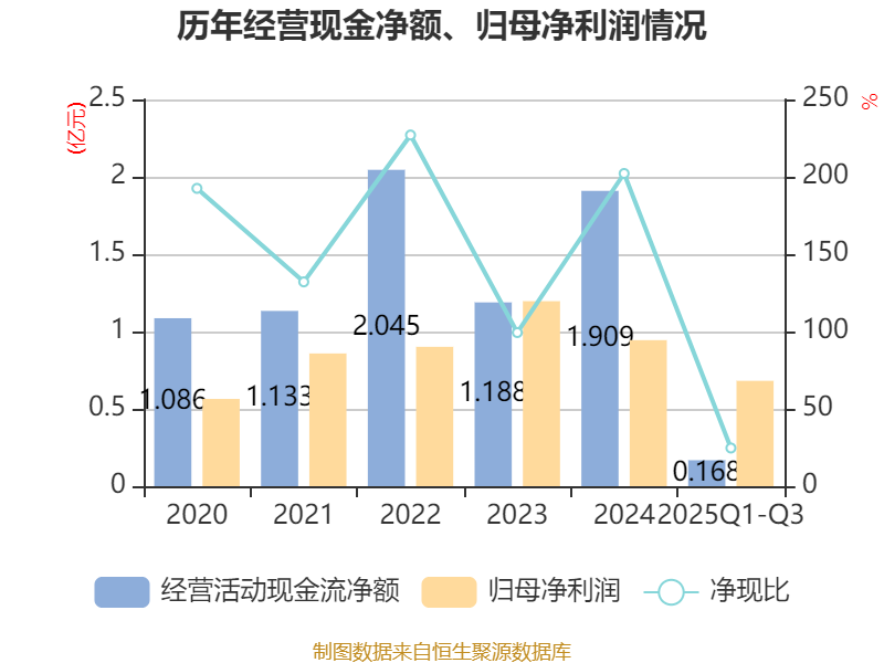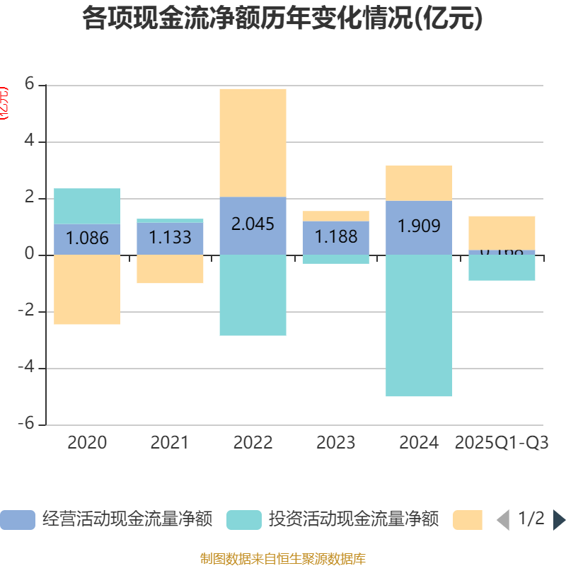 2025年前三季度,公司经营活动现金流净额为1680.41万元,同比下降81.55%;筹资活动现金流净额1.19亿元,同比增加312.87万元;投资活动现金流净额-9152.97万元,上年同期为-3.67亿元。