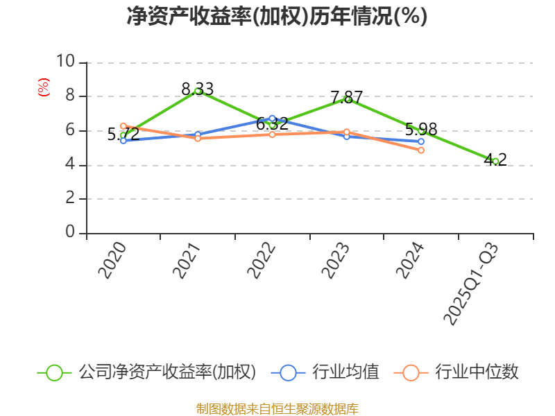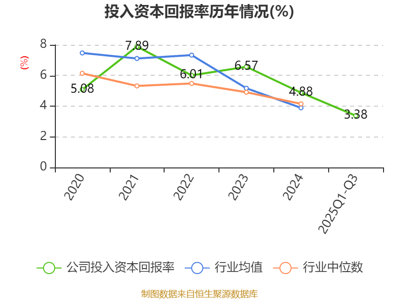 盈利能力方面, 2025年前三季度公司加权平均净资产收益率为4.2%,同比下降0.07个百分点。公司2025年前三季度投入资本回报率为3.38%,较上年同期下降0.09个百分点。