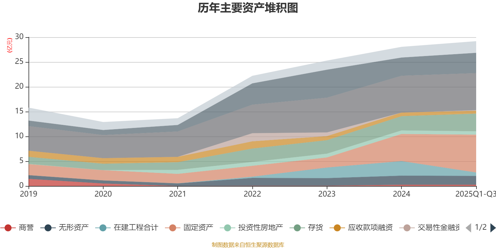 资产重大变化方面,截至2025年三季度末,公司在建工程合计较上年末减少76.17%,占公司总资产比重下降8.07个百分点;固定资产较上年末增加39.33%,占公司总资产比重上升6.6个百分点;存货较上年末增加23.52%,占公司总资产比重上升1.92个百分点;预付款项较上年末增加173.82%,占公司总资产比重上升1.06个百分点。