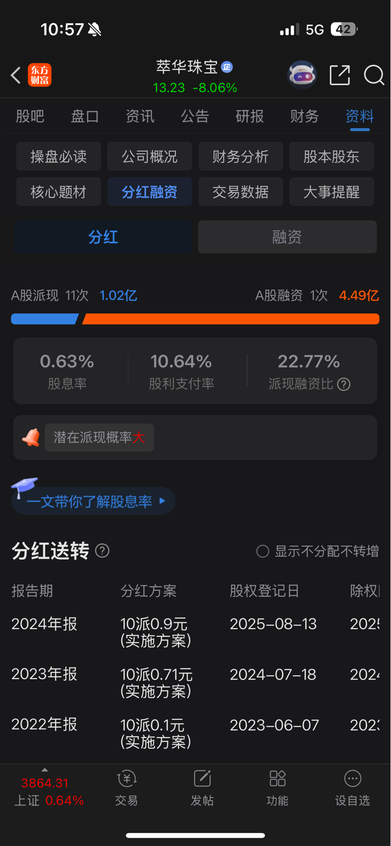 $萃华珠宝(SZ002731)$ 这种垃圾谁会来,上市10年募资4亿,分红1亿