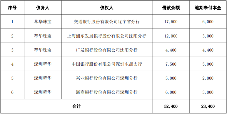 萃华珠宝及子公司合计本金2.34亿元借款逾期
