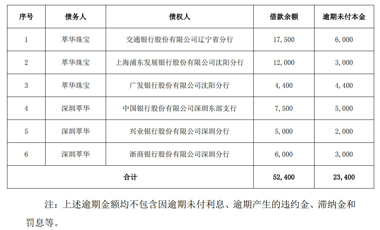 1月28日晚间,萃华珠宝(002731)发布公告,公司及子公司深圳市萃华珠宝首饰有限公司因流动资金紧张,出现部分借款逾期的情况。截至公告披露日,公司及深圳萃华在银行等融资机构的借款逾期本金合计为2.34亿元,具体明细如下(单位:万元):