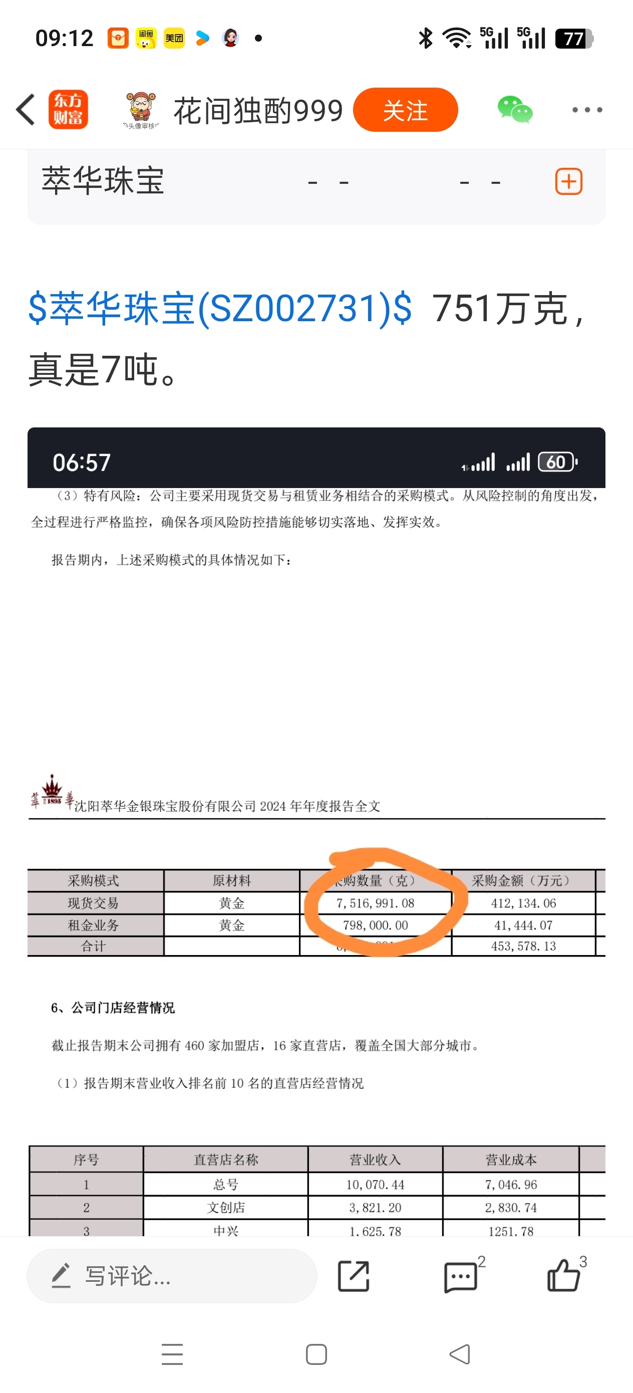$萃华珠宝(SZ002731)$ 公司在手7.5吨黄金,采购价548一克,现在黄金价格1240一克,在手黄金价值90亿,目前公司市值36亿,大家都割肉吧!