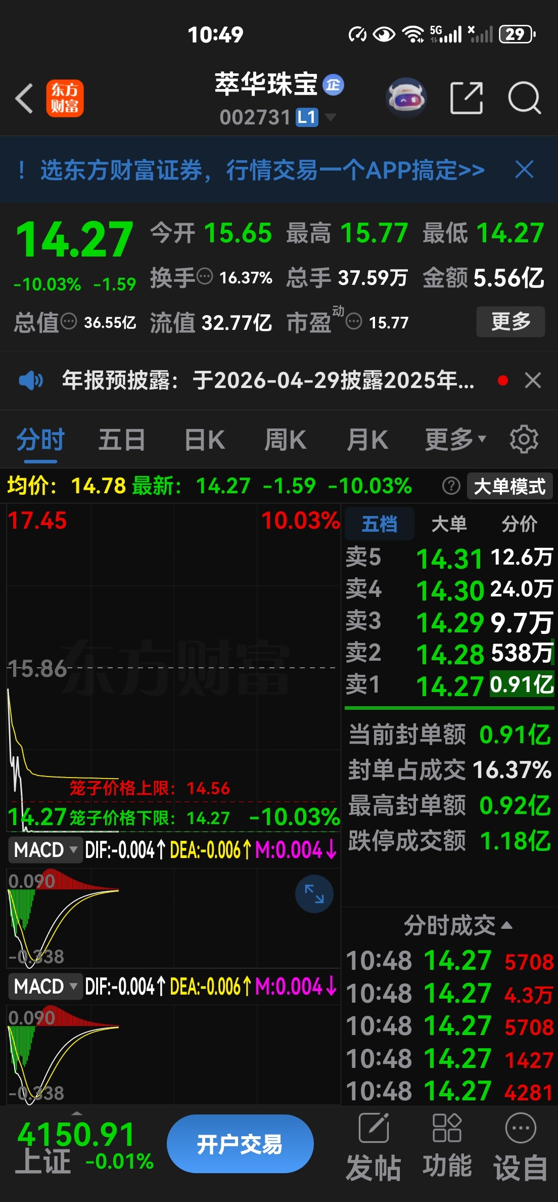 $萃华珠宝(SZ002731)$ 跌停抄底【封单九千万】我来搞一把,,牢记我进了,现在开直播推荐这个库存黄金股,萃华珠宝,跌停赌一把,直播间现在三千三人