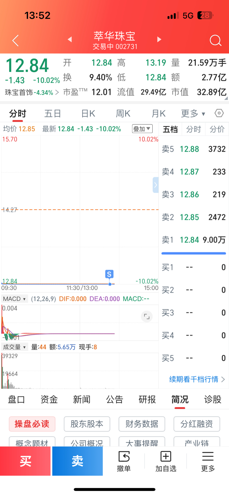 $萃华珠宝(SZ002731)$ 留下的发财。下午地天