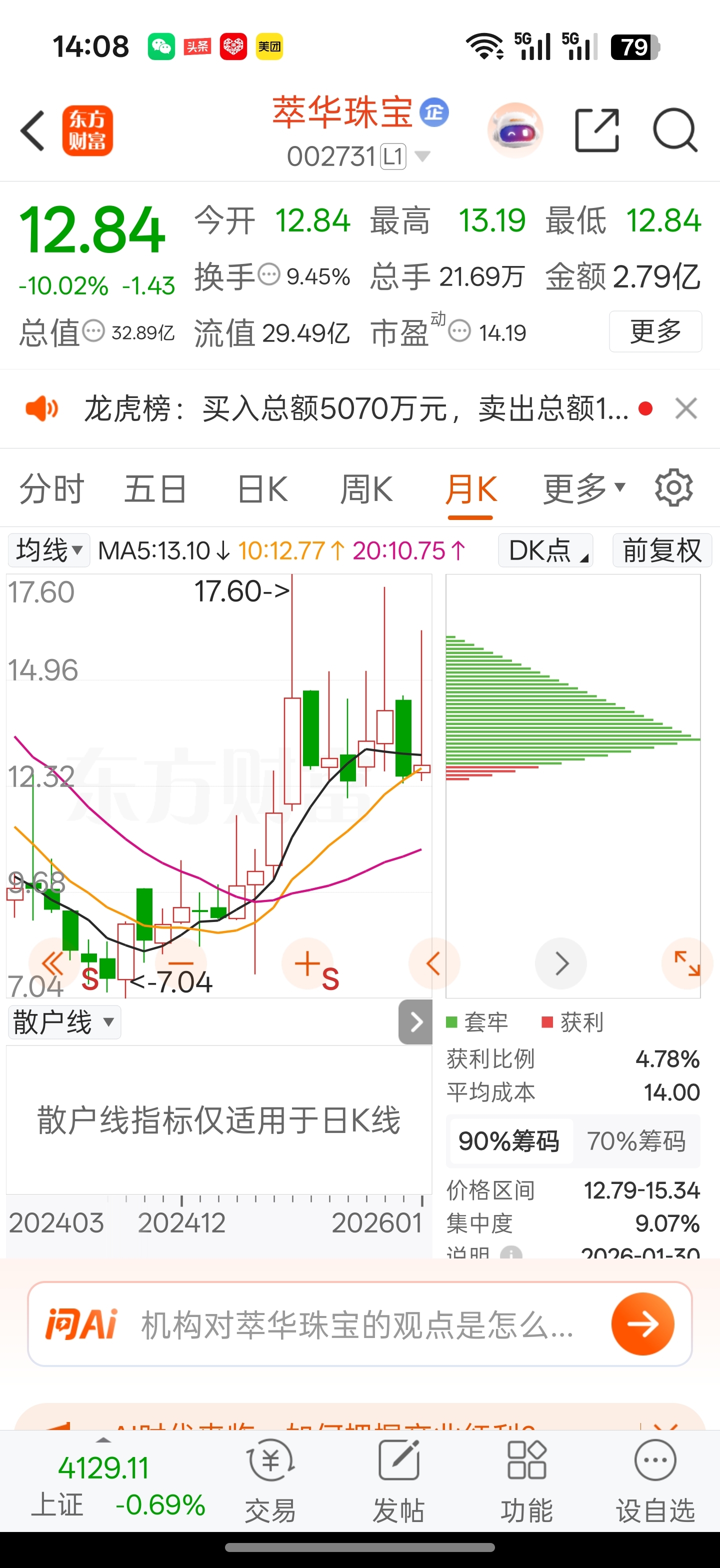 $萃华珠宝(SZ002731)$ 这一波7.04