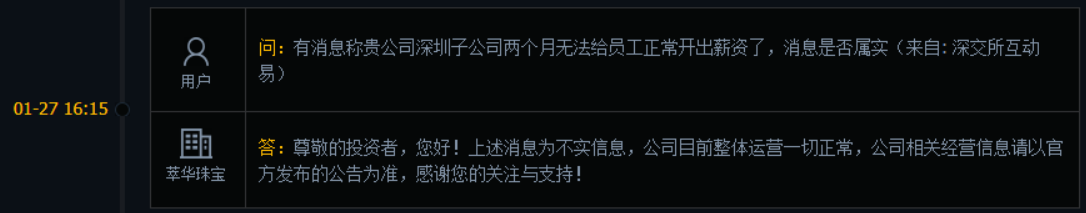 随着萃华珠宝借款逾期公告的发布,公司的股价在1月29日应声跌停,并在1月30日继续跌停。而实际上,关于公司的流动性风险问题,已引起投资者的关注。如1月27日,有投资者在深交所互动易问询“有消息称贵公司深圳子公司两个月无法给员工正常开出薪资了,消息是否属实”,不过公司称上述消息为不实信息。
